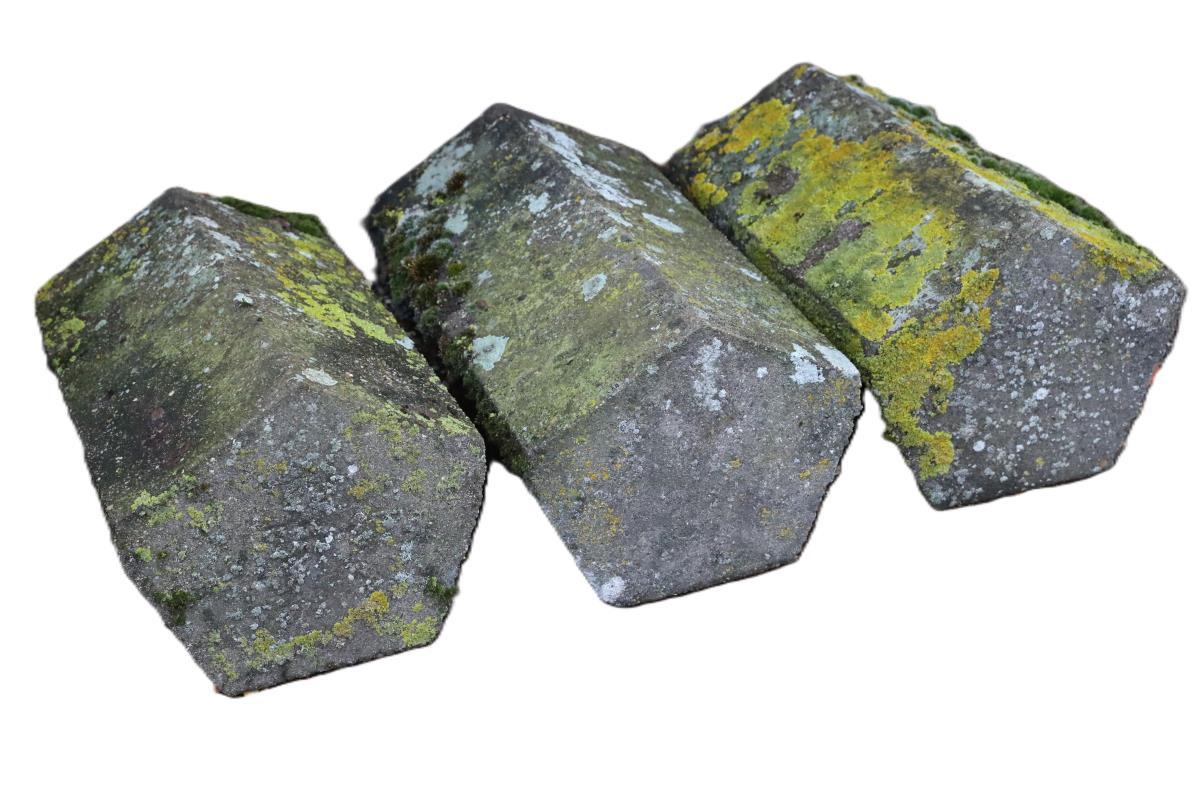 We have over 80 shapes, colours and styles of reclaimed roof ridge tiles in stock in our yard in different materials, colours, styles and sizes, including red and blue clay half-round, hogs back, triangular, roll top and crested ridges in various styles including plain crested, two- and three-hole, club and spike crested.
