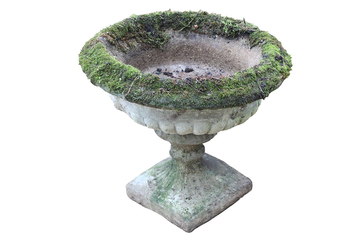 This reclaimed aged composite stone urn displays deep weathering, softened edges, and surface wear earned through decades outdoors. Furthermore, patches of lichen and a moss laden rim confirm long exposure to rain, frost, and changing seasons. As a result, the surface convincingly reflects natural stone while retaining the strength of modern manufacture.