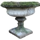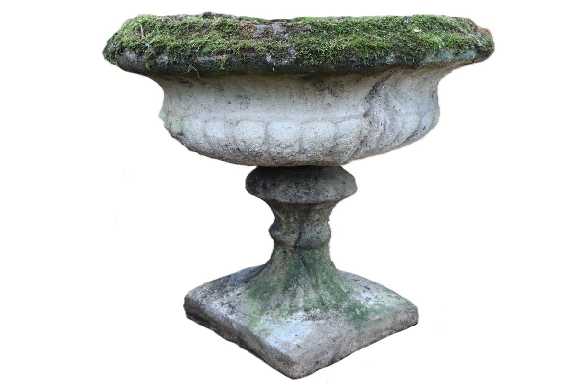 This reclaimed aged composite stone urn displays deep weathering, softened edges, and surface wear earned through decades outdoors. It suits use on weathered stone patios, wild or traditional formal gardens, and brings an authentic rustic patina that adds character and visual interest to any outdoor space. On a plinth, its visual impact is even greater.