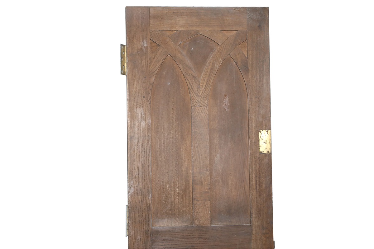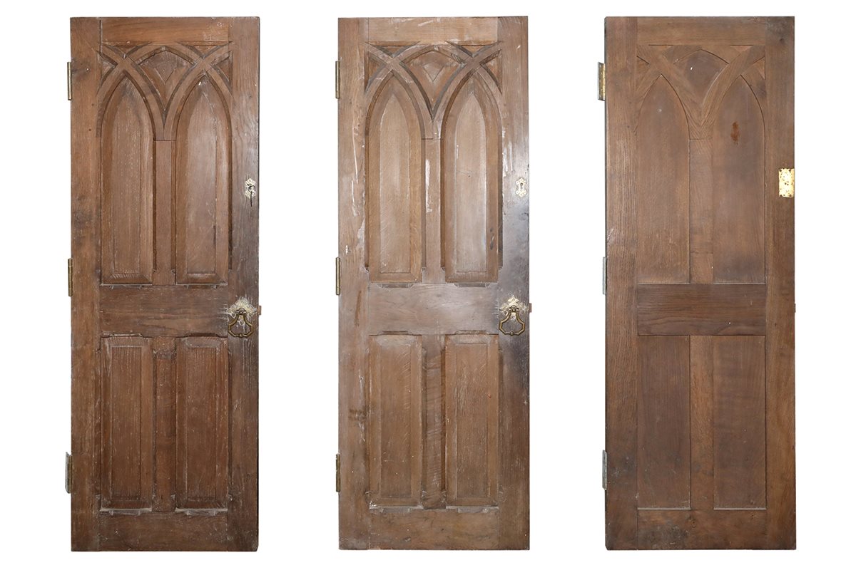 Each antique door displays an overlapping three pointed arch motif, repeated on both sides for perfect symmetry. Additional sculpting on the front adds further depth and detail. The locks remain intact on every door, though only one retains its working key. The decorative pendant handles are made from thick brass with elegant trefoil fittings. This sturdy door furniture enhances the handmade quality of the woodwork, adding a sense of history to any interior.