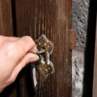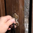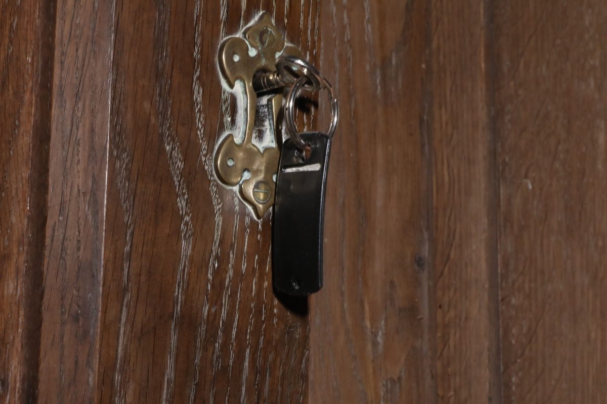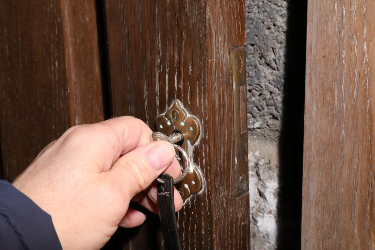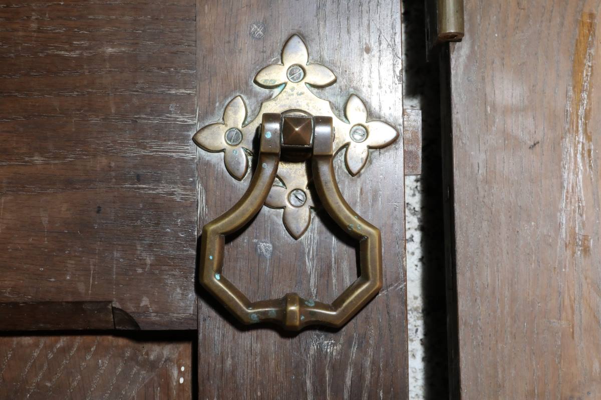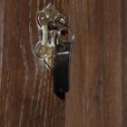 These antique handmade oak church doors show their age beautifully. Scuffs, scratches and subtle marks speak of centuries of use and care. Around the brass handles and lock plates, traces of old wax and cleaner show regular maintenance over the years. Their surface carries a natural patina that only true age can achieve. Each imperfection adds to their authenticity and depth of character.