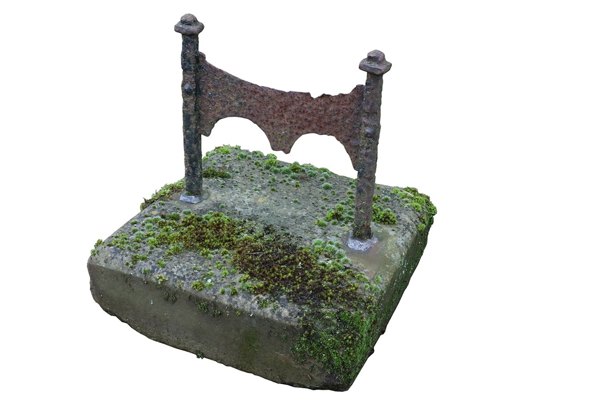 Moss and lichen pepper the stone, clearly displaying age earned through decades of outdoor exposure. Similarly, the worn wrought iron blade shows notches, surface corrosion, and softened edges from repeated use. These details confirm the reclaimed nature and long service life of this antique Yorkstone boot scraper.