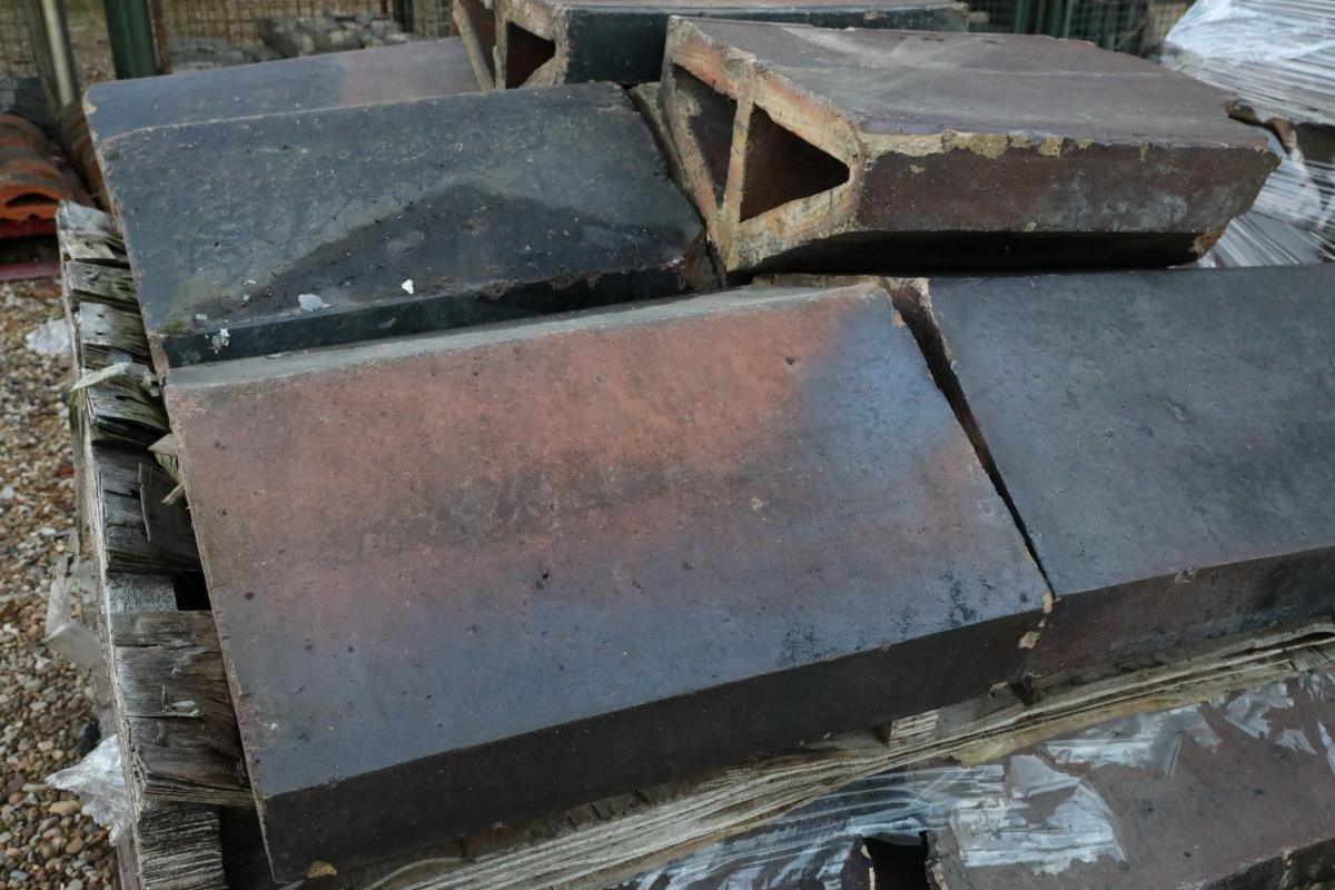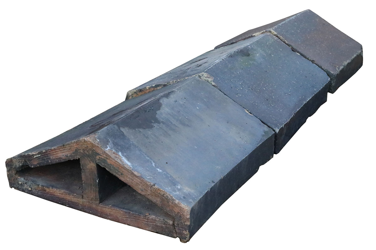 Reclaimed extra large glazed blue brindle saddleback wall copings bring practical protection and historic character to any brick or stone wall. Wall copings first appeared on early masonry structures to stop water from penetrating joints. Builders continued to use them as brickwork spread because they protect a wall’s core while giving it a finished profile. This long tradition remains relevant today, and these pieces follow the same principles.