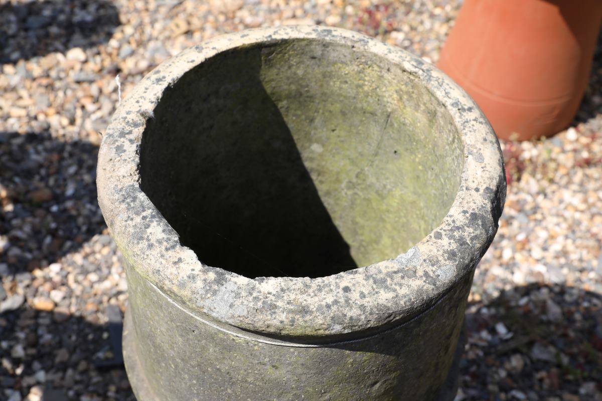 This reclaimed buff roll top chimney pot offers a distinctive feature for gardens seeking texture and heritage. This example features a straight-sided profile, which is less common than the familiar tapered cannon form. Consequently, its understated shape, and weathered patina, pairs well with both traditional planting schemes and more structured layouts.