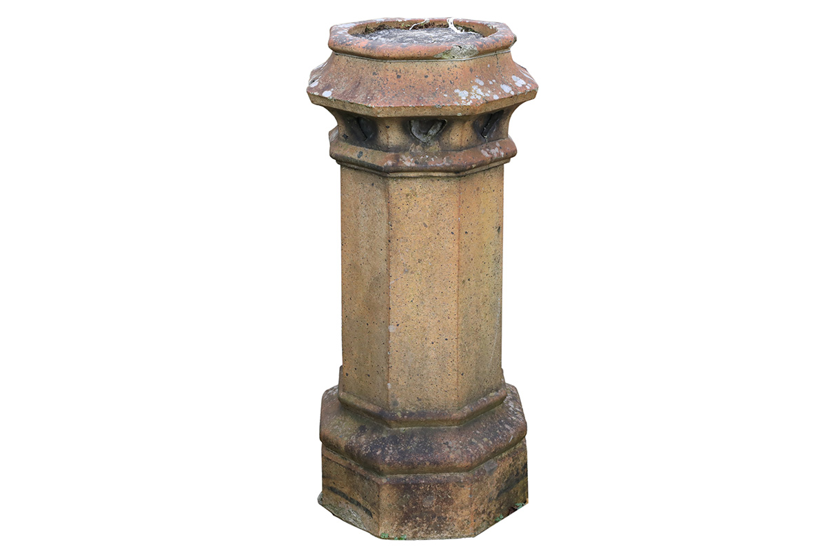 This example stands 30 inches tall and follows an octagonal form from base to rim. Subtle changes in width add visual interest along its height. At the top, triangular vents appear on each face. These vents help regulate airflow while introducing distinctive geometric detail. Therefore, this buff vented chimney pot combines practical design with sculptural presence.