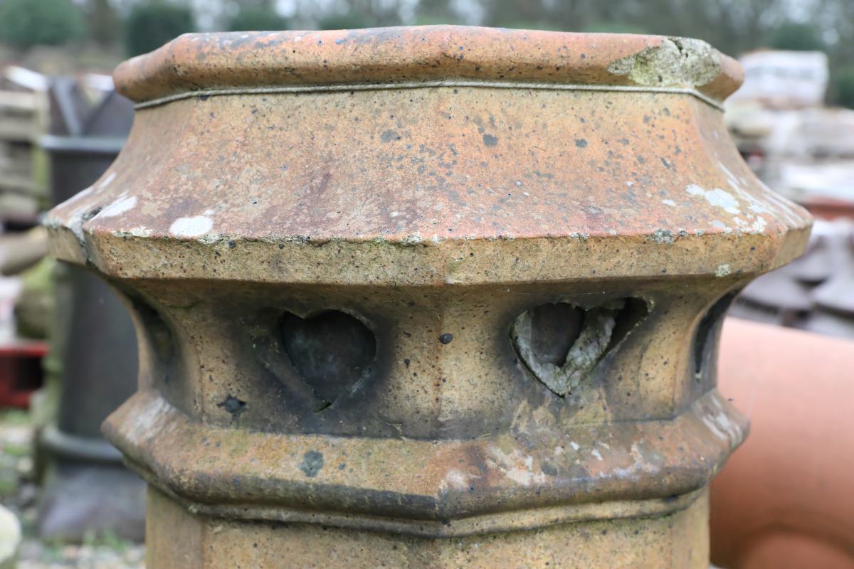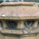 Unlike our other chimney pots, this octagonal vented example includes a concrete cap. The cap creates a stable platform for smaller pots or urns. Although careful removal is possible, garden use makes retaining the plug practical. Positioned among planting, the pot provides height and structure.
