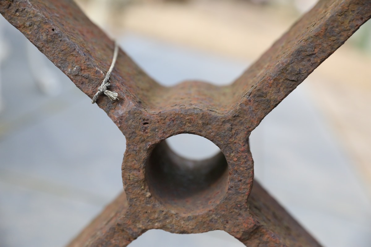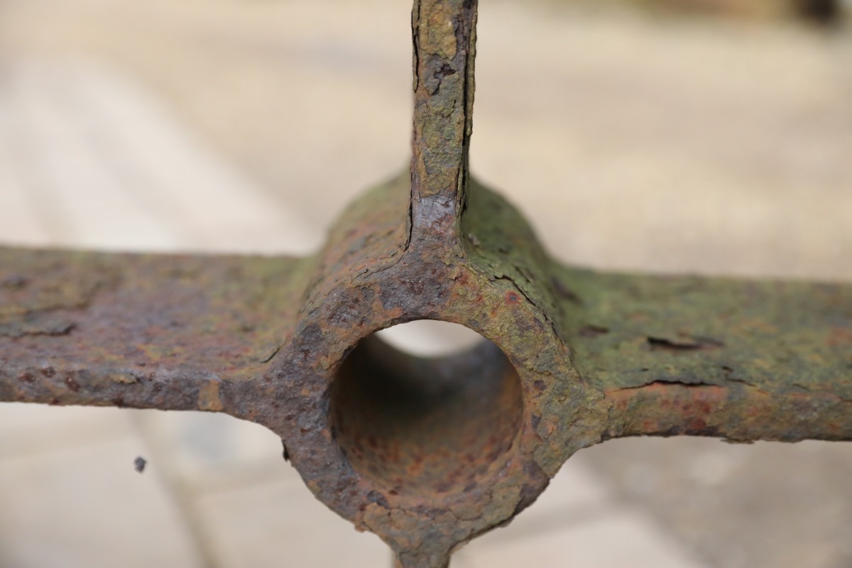 As true antiques, these wheels show clear signs of age and honest service. Surface corrosion covers all areas, yet you can remove it easily with a wire brush or abrasive disc. Minor edge wear and surface scratches speak of decades of labour. This weathered patina reflects their industrial past and allows each factory cart wheel to settle naturally into both established and newly designed spaces.