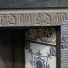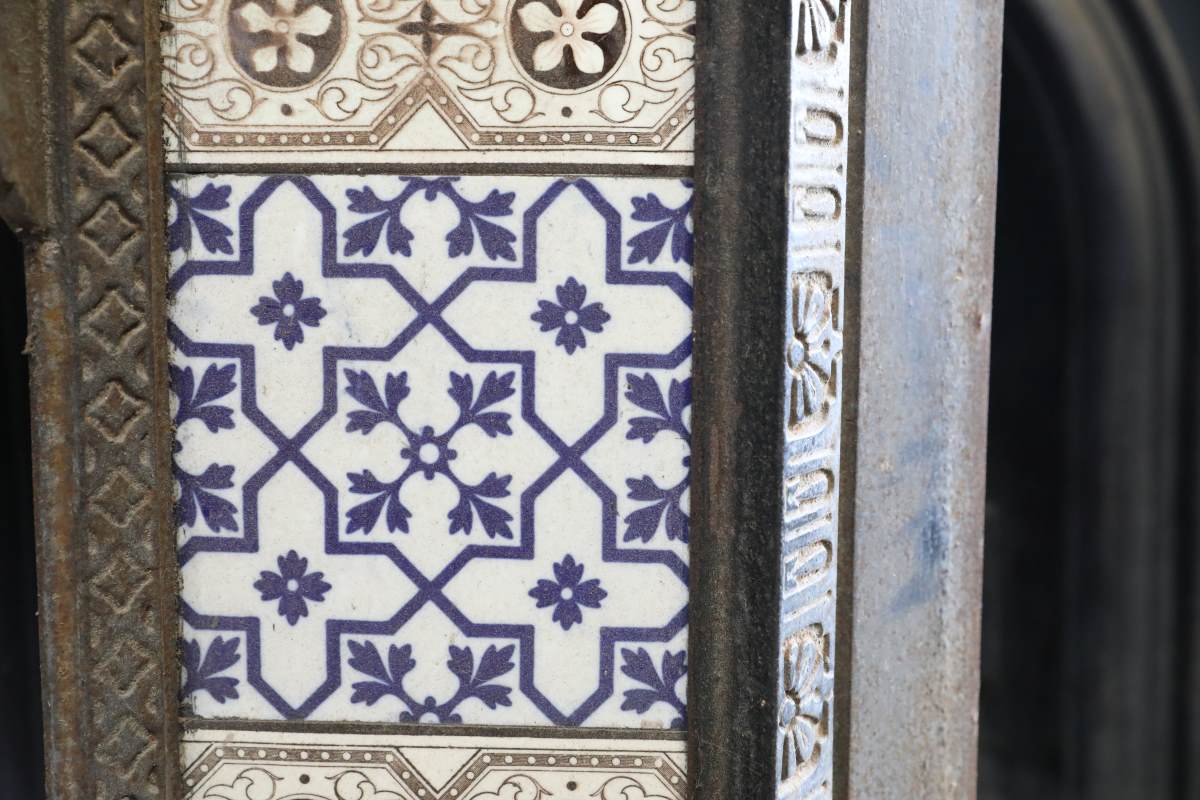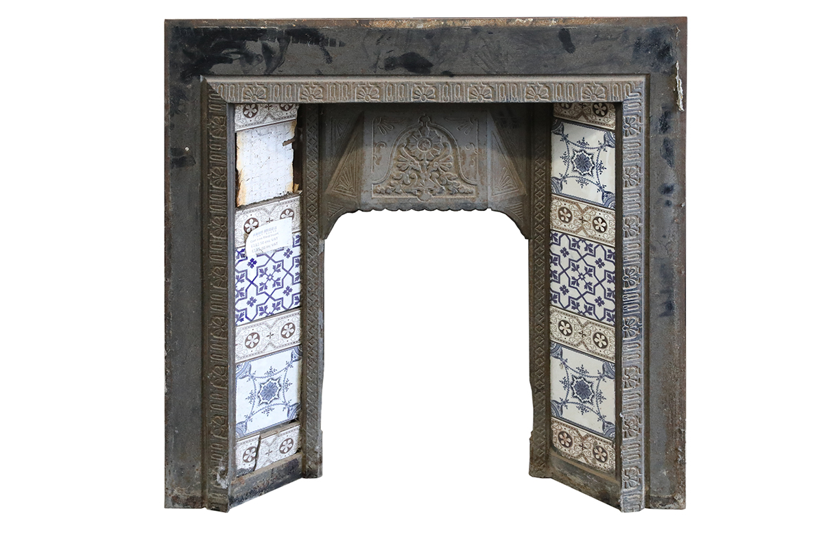 In keeping with Victorian taste, this cast iron tiled fireplace insert features ceramic tiles flanking the hearth opening. The tiles reveal Eastern influence through geometric forms softened by floral detailing. Consequently, they lighten the signature dark finish of the ironwork. This contrast creates a lively centrepiece within a suitable period room, especially when matched with a suitable surround.