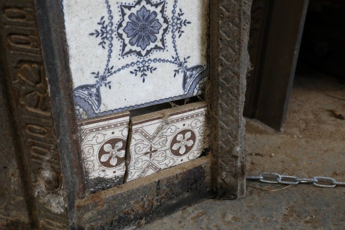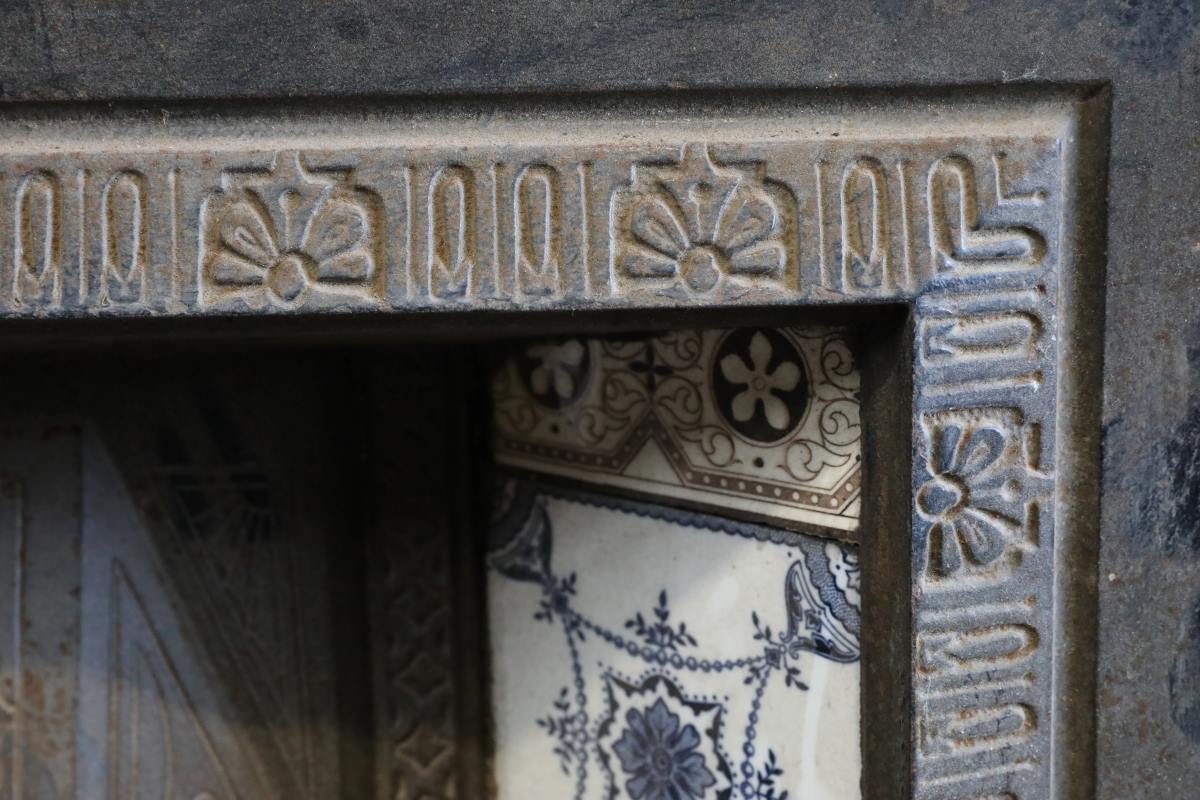 The insert displays honest signs of age and prior use. Surface corrosion marks the iron, while several tiles are missing or cracked. Additionally, wear appears along one internal edge where a fire basket once rested. With careful refurbishment, the cast iron tiled fireplace insert could resume working use. However, given its extensive wear, many buyers may prefer decorative display.