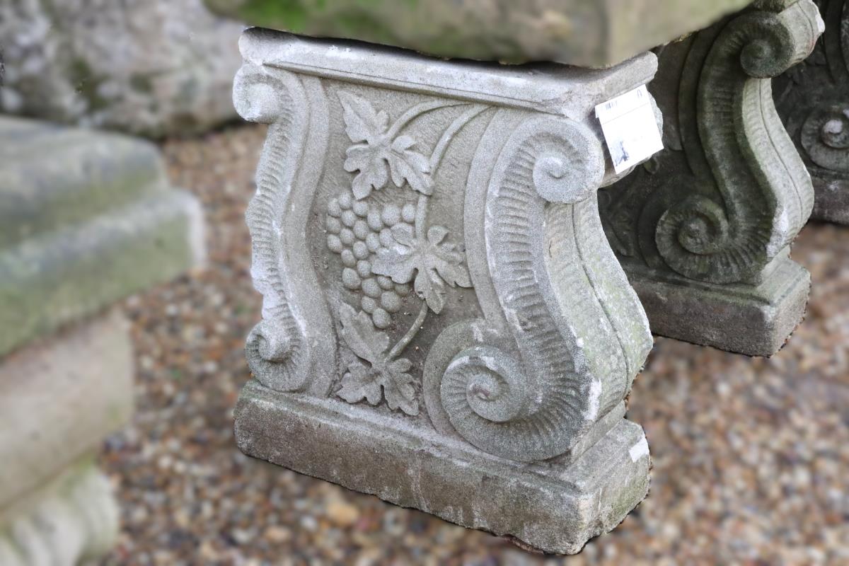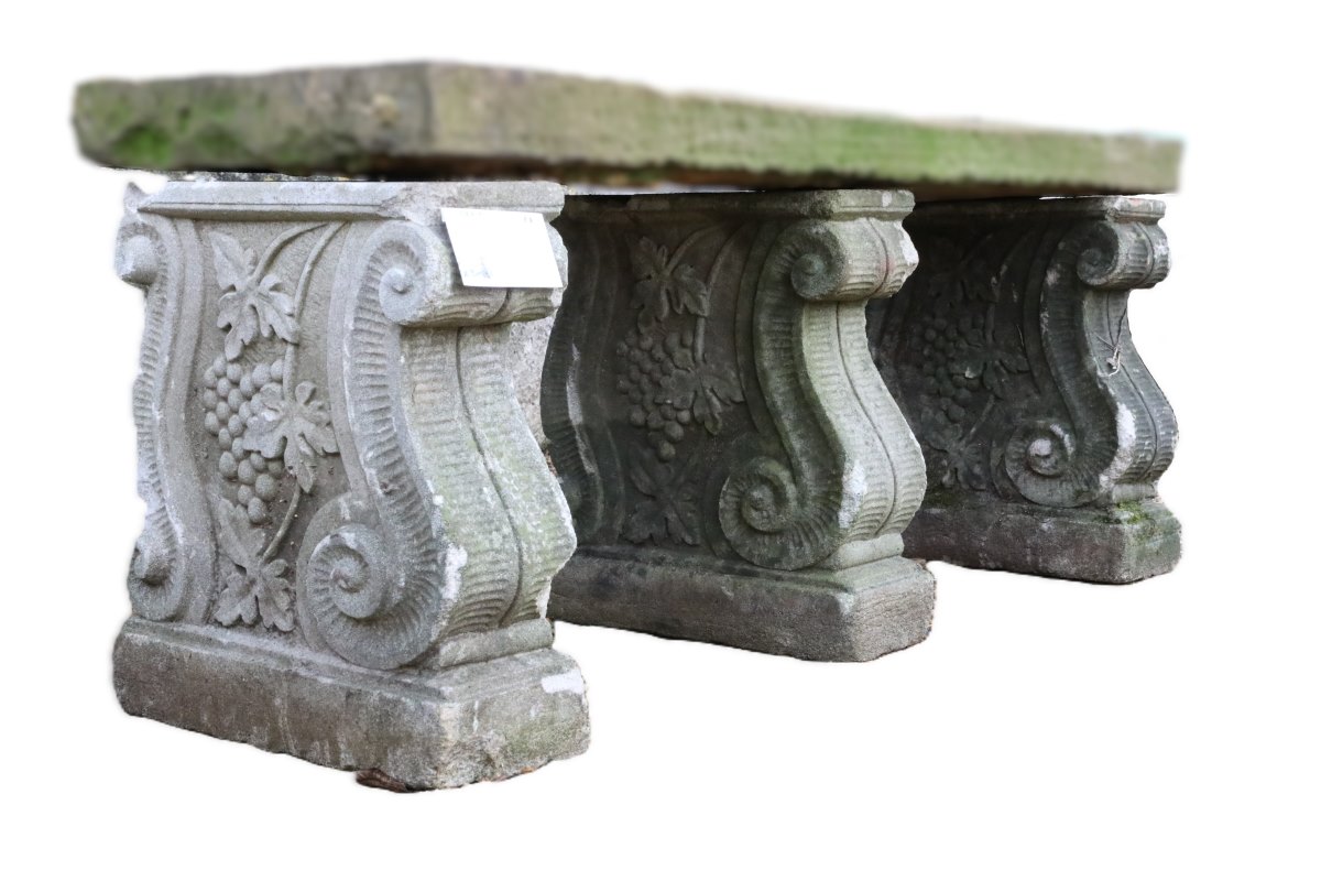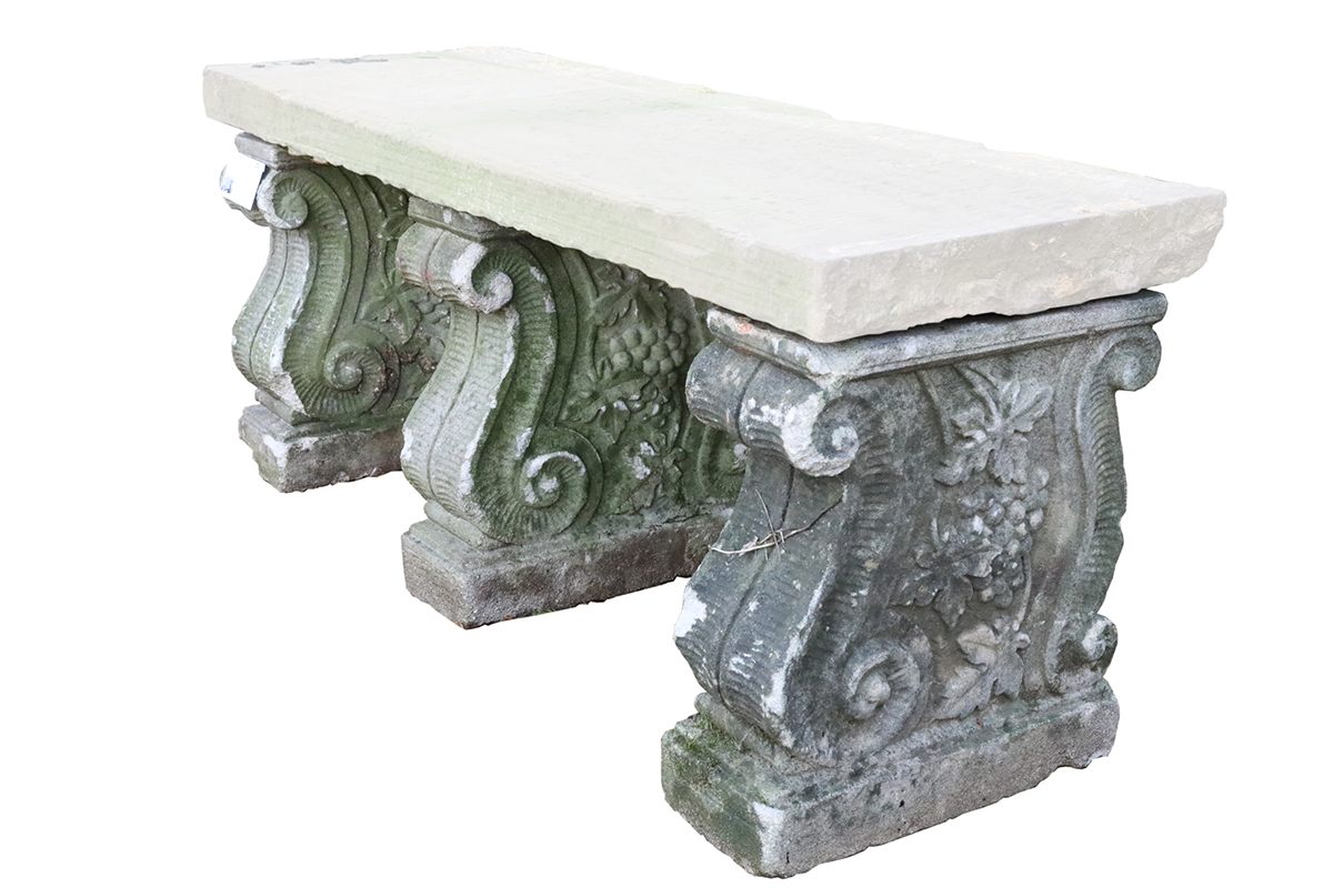 This set of three reclaimed weathered composite stone bench supports offers structure, history, and adaptability for garden seating. Originally, they supported a wide composite stone bench seat that has since been lost. However, the surviving supports retain strong visual presence and clear architectural intent. Each support displays a classical raised scroll and vine motif inspired by historic garden ornament. These decorative details reference traditional craftsmanship without appearing heavy or overbearing.