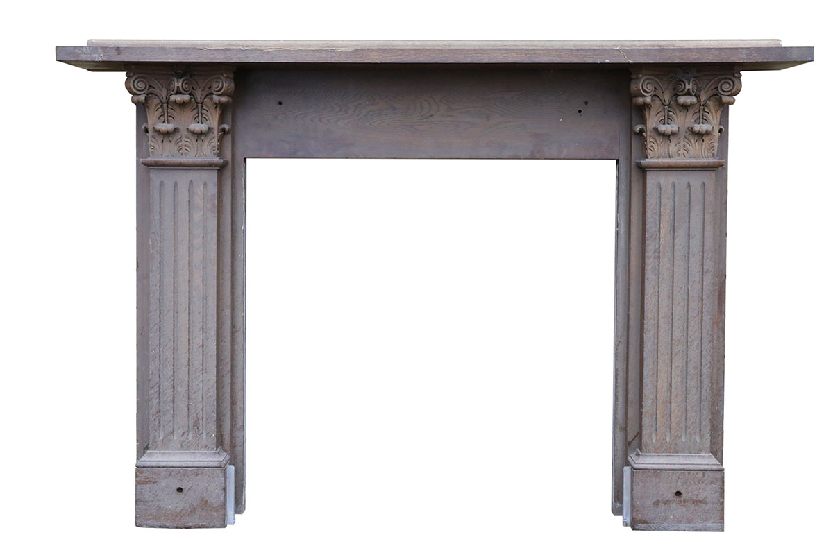 This Corinthian style hardwood fireplace surround showcases the elegance and craftsmanship inspired by ancient Greek design. This style has become a favourite for interiors seeking a classical, structured aesthetic, complimenting traditional design or providing detailed contrast to more contemporary interiors. A sturdy piece, it requires only minor refurbishment.