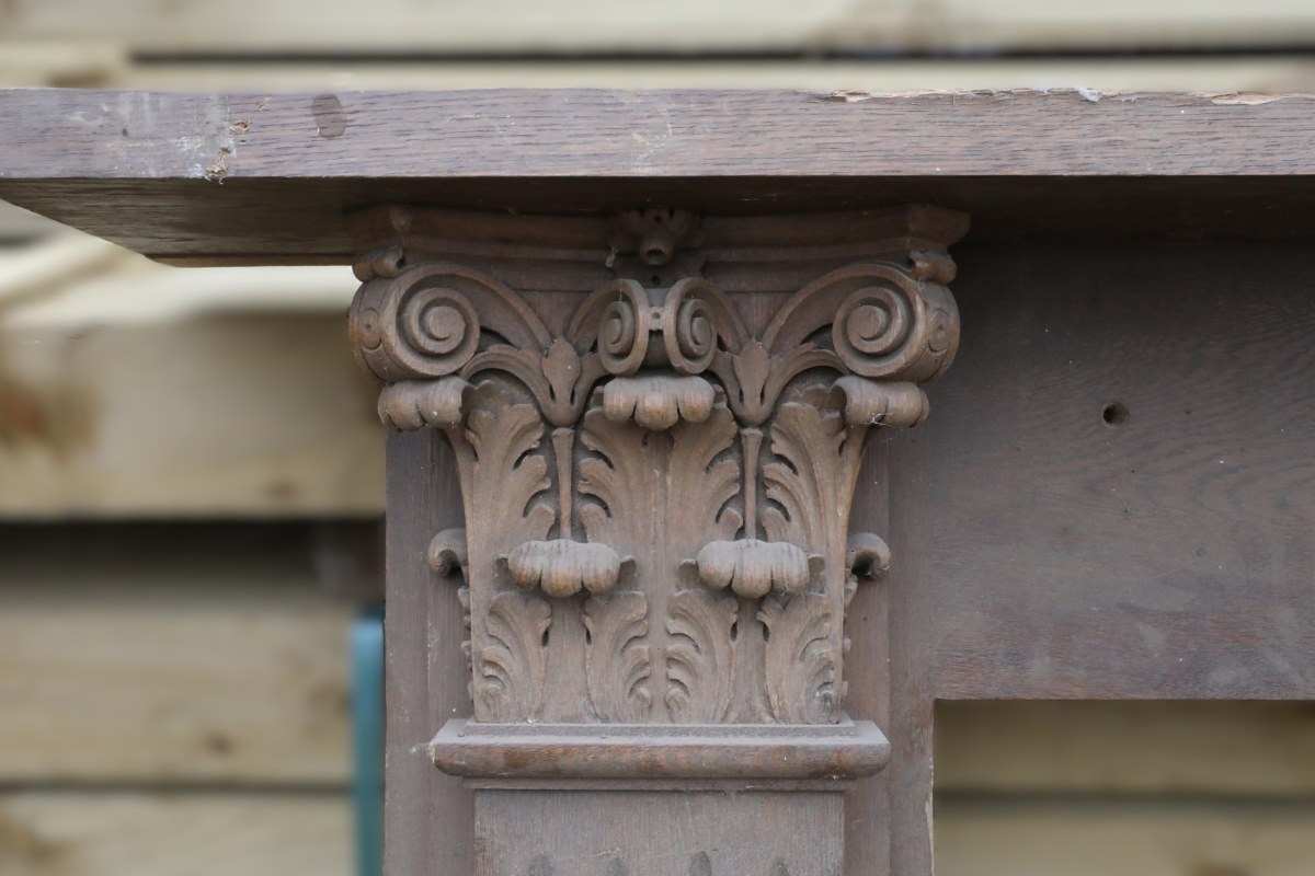 Measuring 163cm wide, 23cm deep and 115cm tall, this piece commands attention without overpowering a room. Moreover, the subtle header and well-proportioned plinths balance the intricate carvings, creating a harmonious composition. This Corinthian style hardwood fireplace surround has spent time in storage and shows its age through worn edges and light surface marks. However, these details add authenticity and invite restoration. With a gentle clean and light polish, its natural colour and historical influence will emerge beautifully.