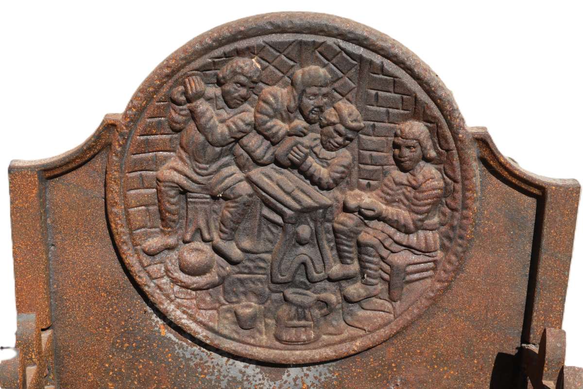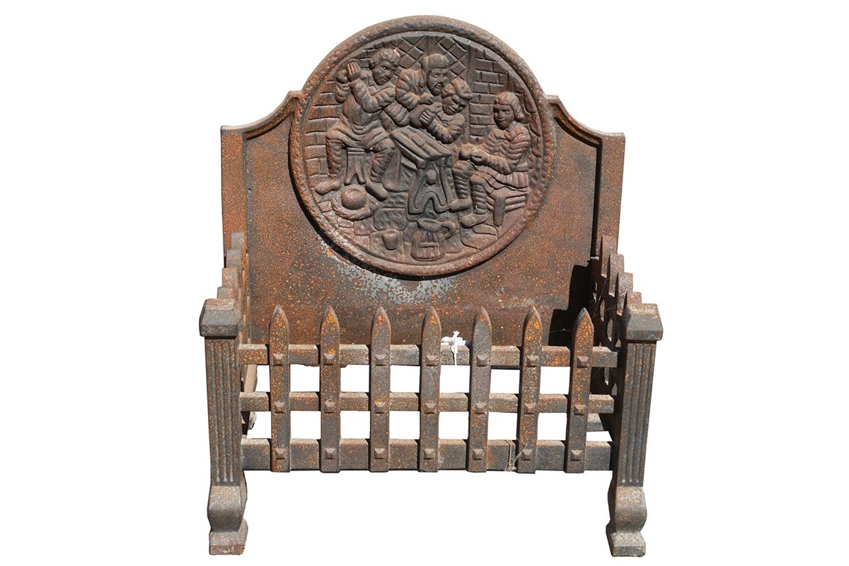 The detailed scene cast into the back immediately draws attention. It appears to depict several figures gathered in a breakfast setting, adding narrative interest. Consequently, this decorative back fire basket becomes more than a practical object, acting as a visual focal point.