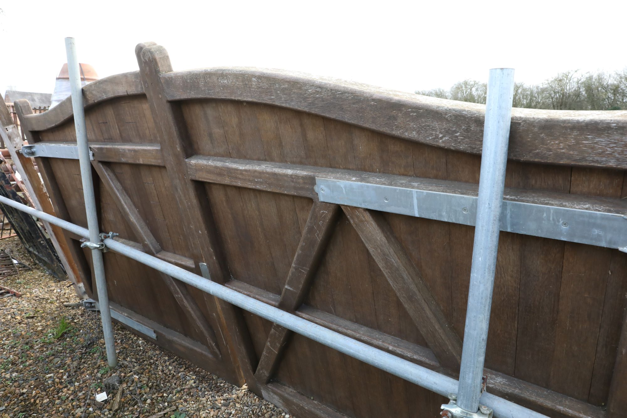 This pair of Electric Wooden Gates combines functionality, durability, and classic appeal. Measuring 3.75m wide, including the gateposts, they offer a commanding presence at any entrance. At their tallest point, they stand 1.75m high, gently sloping to 1.6m at the lowest. With a substantial 7cm thickness, these gates provide strength and stability.