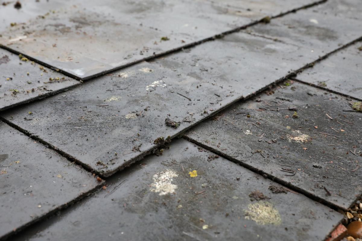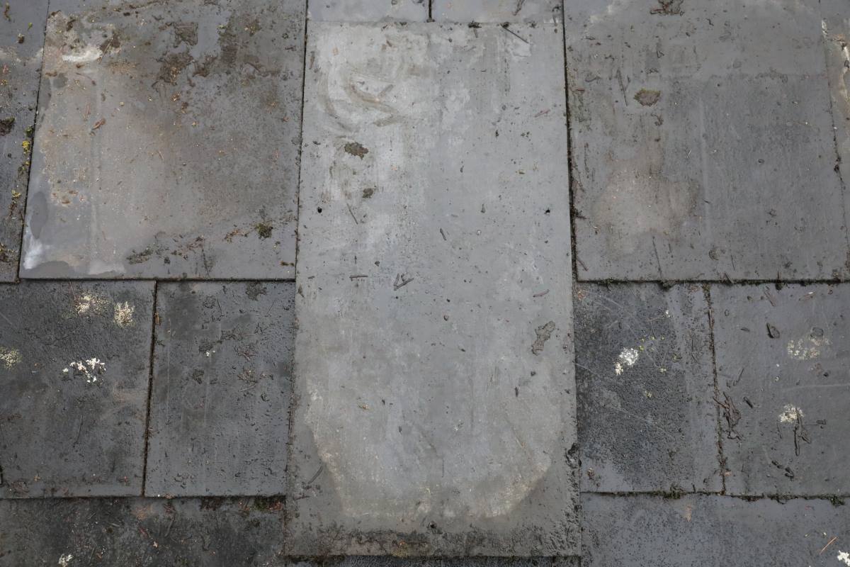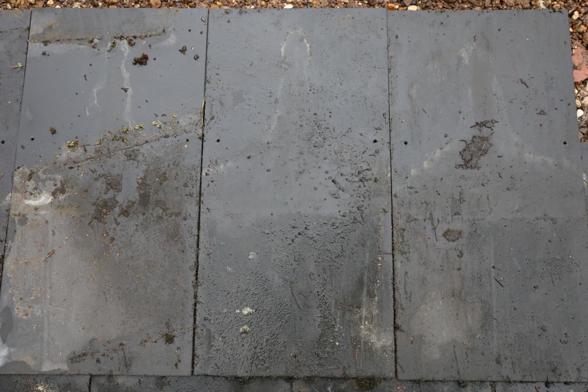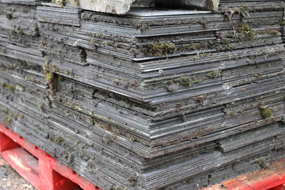 As reclaimed materials, these fibre cement roof slates show honest signs of previous use. Environmental discolouration appears across many surfaces. Minor patches of lichen sit lightly on some faces. Small chips mark occasional corners or edges. However, most slates remain structurally sound and ready for reuse.