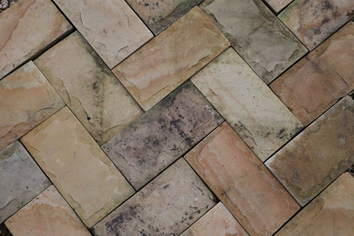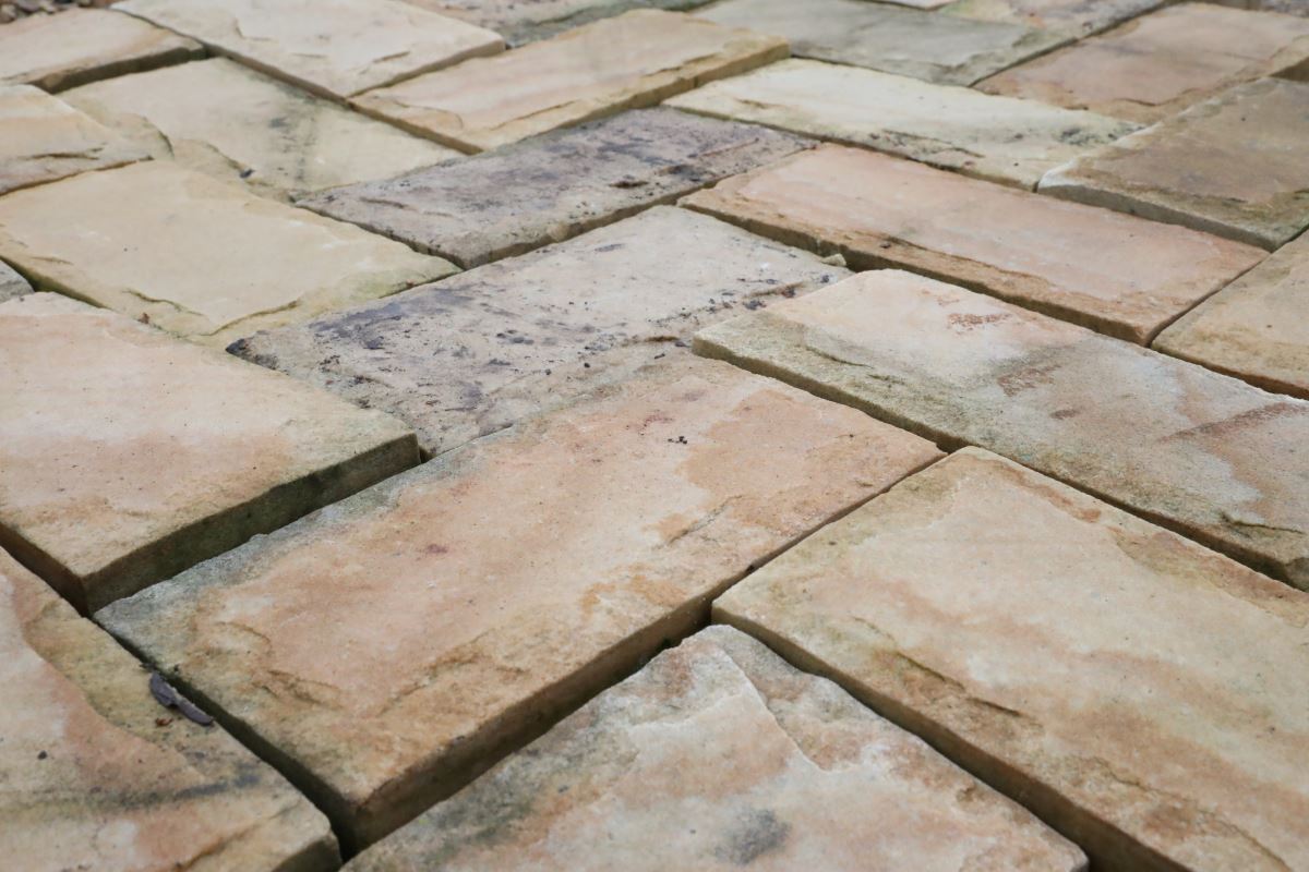 These Fossil Mint Sandstone pavers offer a practical and visually settled option for gardens, paths and driveways. Sandstone performs reliably in the wet and frost, and in high foot or light vehicular traffic environments. Although unused, years of outdoor storage has weathered them, softening the look which helps them sit comfortably within established landscaping schemes.