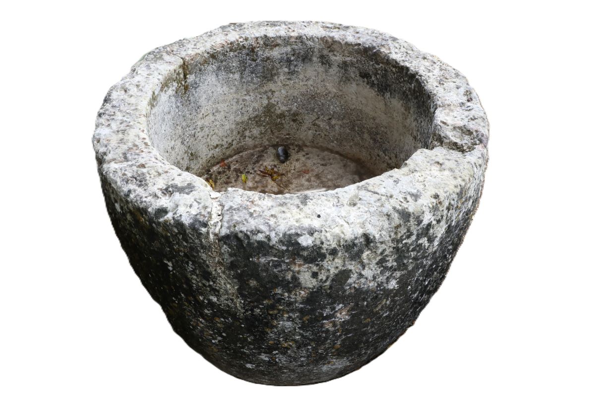 This reclaimed antique French limestone bowl trough is a striking and substantial piece of stone craftsmanship. Its impressive proportions suggest use as bold planter for small trees or as a striking centrepiece in a water feature. With a drain hole to one side, the trough offers excellent drainage, making it practical as well as beautiful.