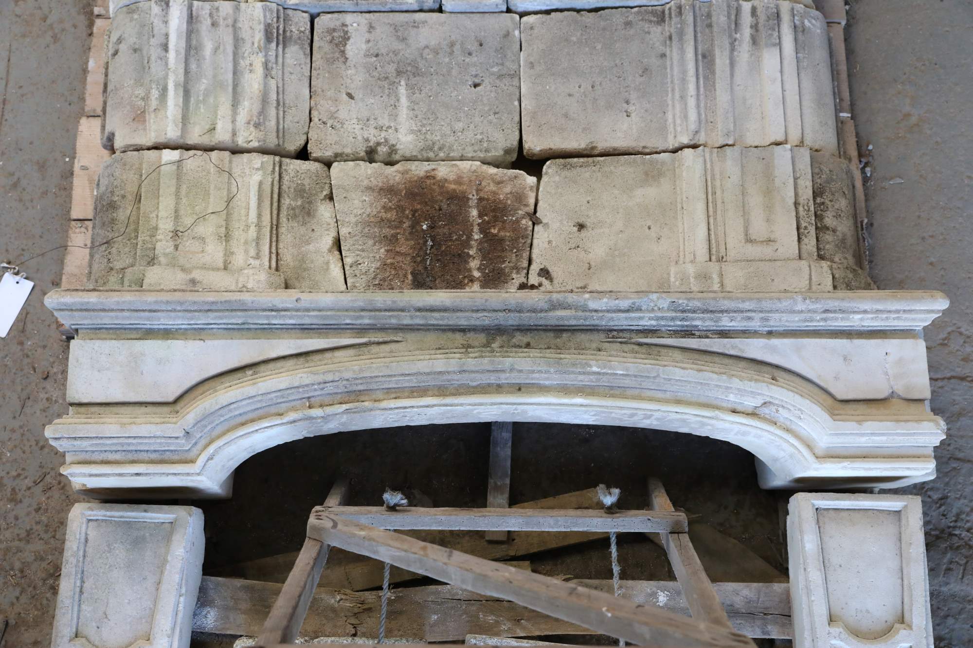 This reclaimed fire surround, crafted in the early 1800s, showcases classic proportions and fine detailing. The trumeau, forming the overmantel, enhances its imposing presence. Weathered surfaces, softened edges, and subtle patina reflect centuries of use. Some stones bear staining, while others show minor breaks due to age and movement during reclamation. Despite this, the fireplace remains mostly intact, preserving its authentic character.