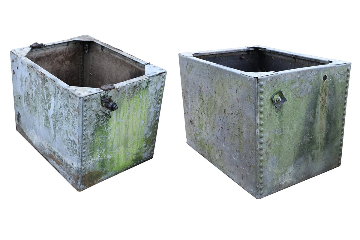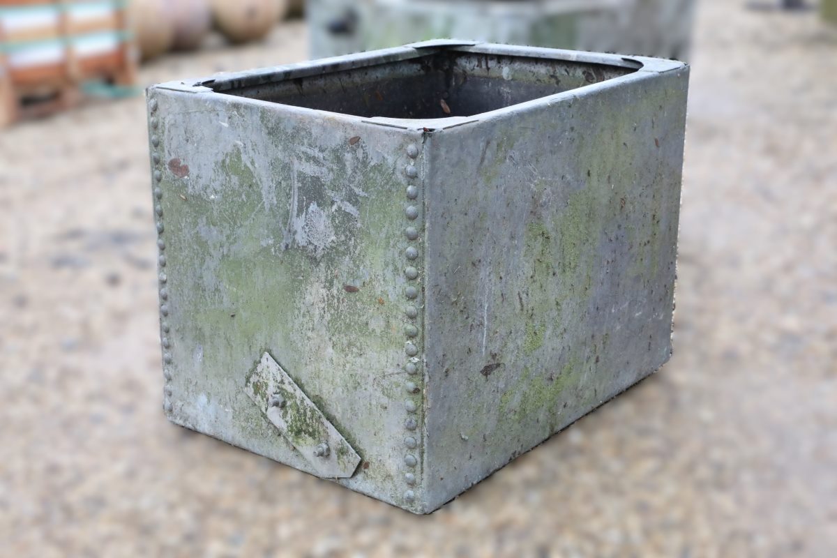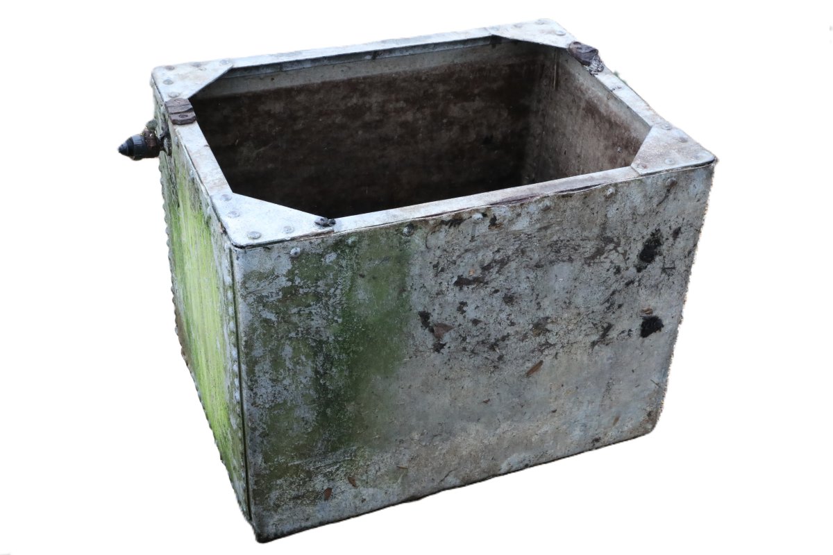 Galvanising originated in the eighteenth century, when craftsmen discovered zinc’s ability to protect iron from corrosion. The process coats steel in zinc, which sacrifices itself to prevent rust formation. Consequently, galvanised metal, like this rivetted tank, resists moisture damage far better than untreated alternatives. This makes it especially suitable for garden equipment and outdoor features exposed year round.