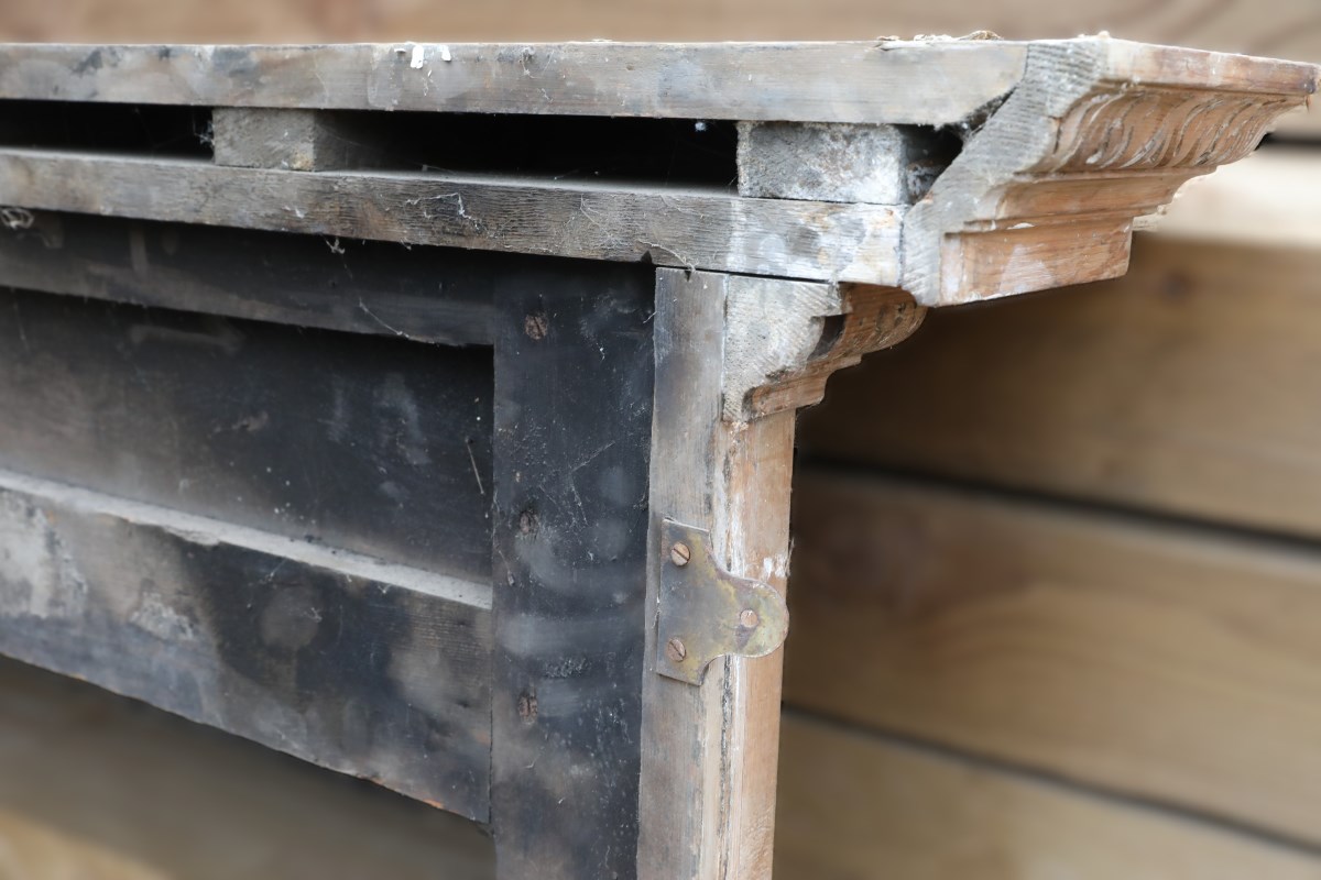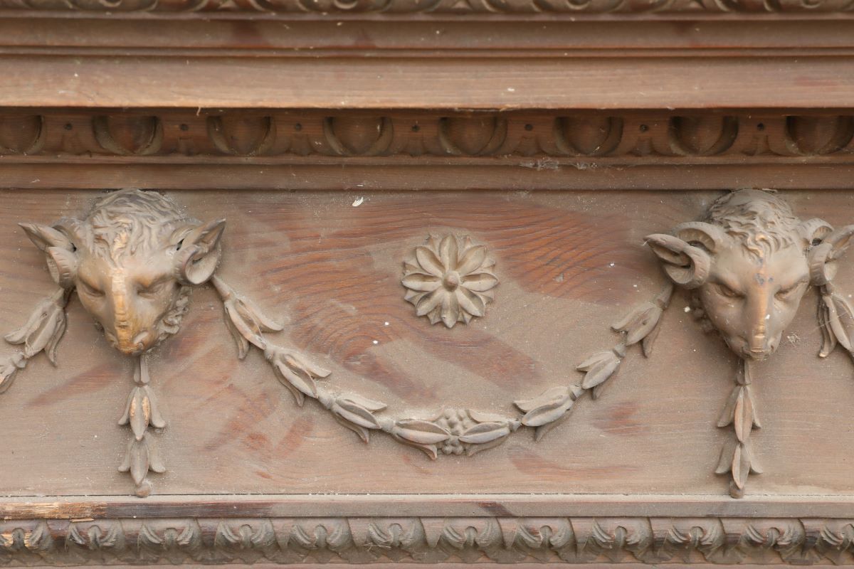This reclaimed hand carved piece carries clear signs of age and previous use. Light scuffs, worn edges and a thin layer of dust suggest several years in storage. On the reverse, soot from years of fires has darkened the timber, particularly in one corner. These marks lend authenticity, reflecting its working past and giving the piece a distinctive, rustic appearance. For a more polished finish, light refurbishment would restore the wood’s depth of colour and reveal the intricate carving in even greater detail. Whether left as found or carefully restored, this reclaimed hand carved rams head fire surround will bring character to any interior.