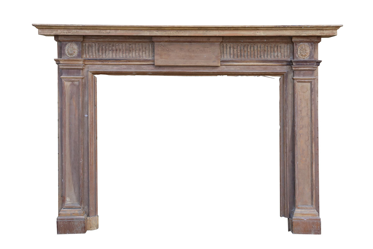 The design is refined yet robust. A raised plain panel, ideal for a motto, date or family crest, sits above a fluted mantel. Each side features rosettes above beaded columns, completing the classic composition. This hand carved fireplace surround complements a traditional setting with ease. However, it also provides a striking contrast in a modern interior, bringing warmth and individuality.