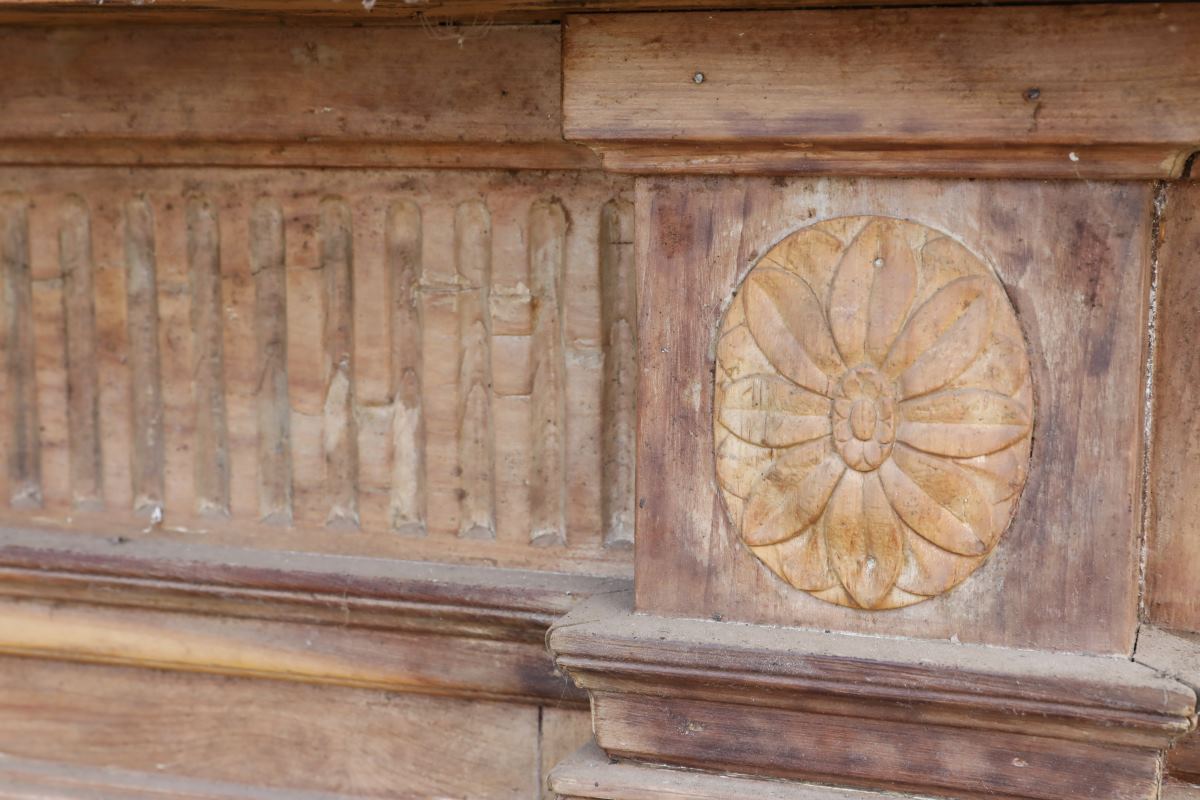 Years spent in storage have left marks of age across the surface, giving the hand carved fireplace surround a rustic patina. Small scratches, wear marks and subtle water staining show its journey through time. Additionally, some repairs at the base of the legs reveal its reclaimed history, with one section awaiting attention. However, these details add authenticity and offer an opportunity for restoration. With careful refurbishment, this fireplace surround can regain its former elegance while keeping the character earned through age.