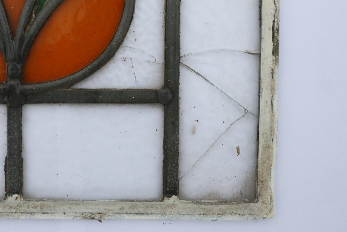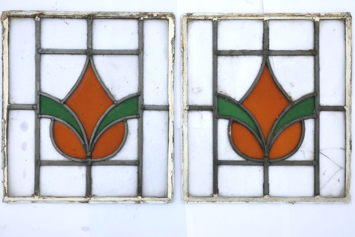 These reclaimed, vintage leaded stained glass windows capture the artistry and craftsmanship of a bygone era. Each panel displays rich colours and intricate leadwork, recalling centuries of British design tradition. Reclaimed from older properties, these pieces show signs of age, including remnants of window putty, small cracks in one or two panes, and scuffs in the lead surrounds. Far from detracting from their beauty, these details add authenticity and character. The patina speaks of their history and ensures each piece remains entirely unique.