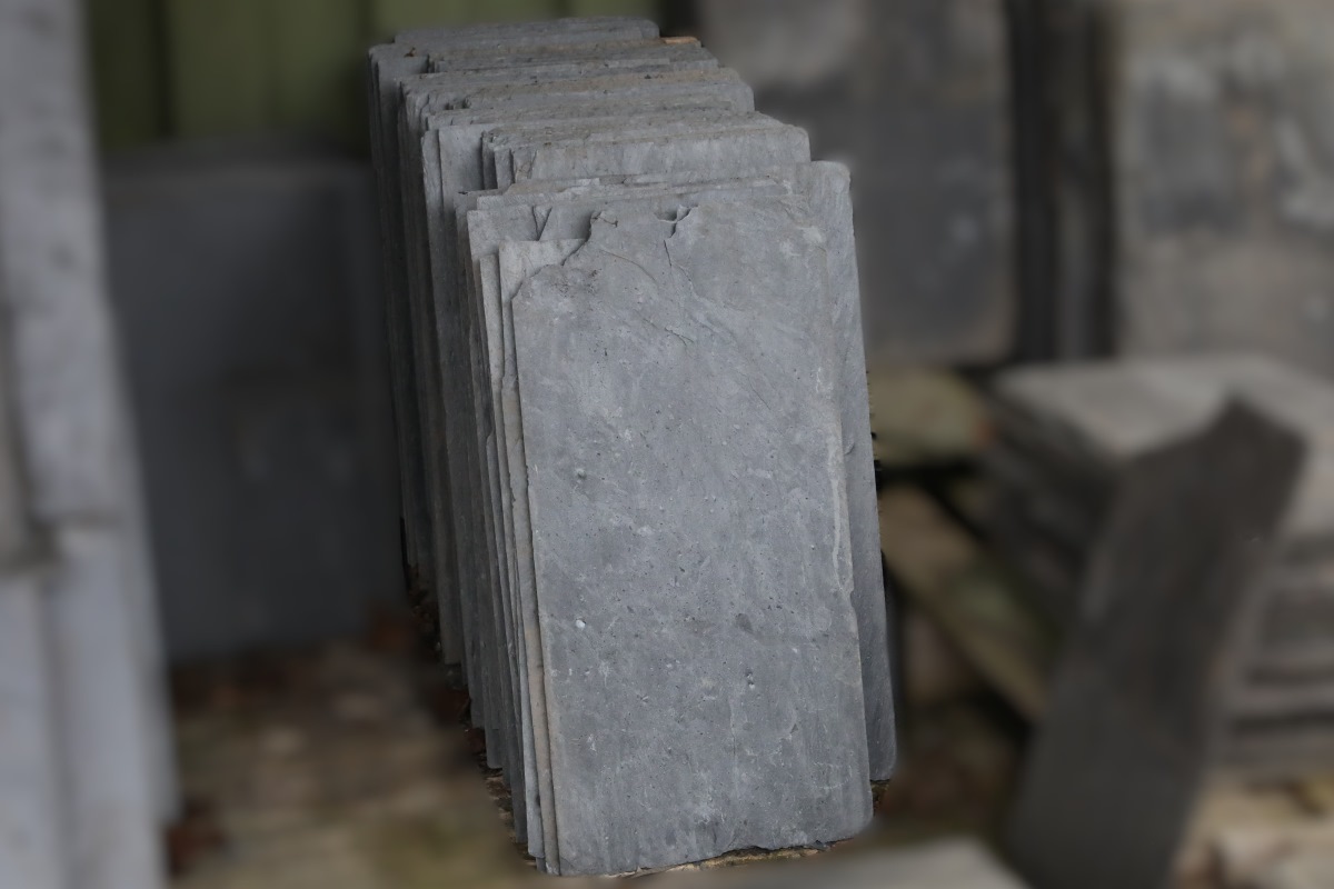 These particular new Spanish roofing slates are unused, yet storage has created light edge wear and occasional small chips. Importantly, slate roofs rely on overlapping courses, so minor edge imperfections rarely affect weather protection. Therefore, these new Spanish roofing slates remain fully suitable for roofing projects despite visible storage marks.