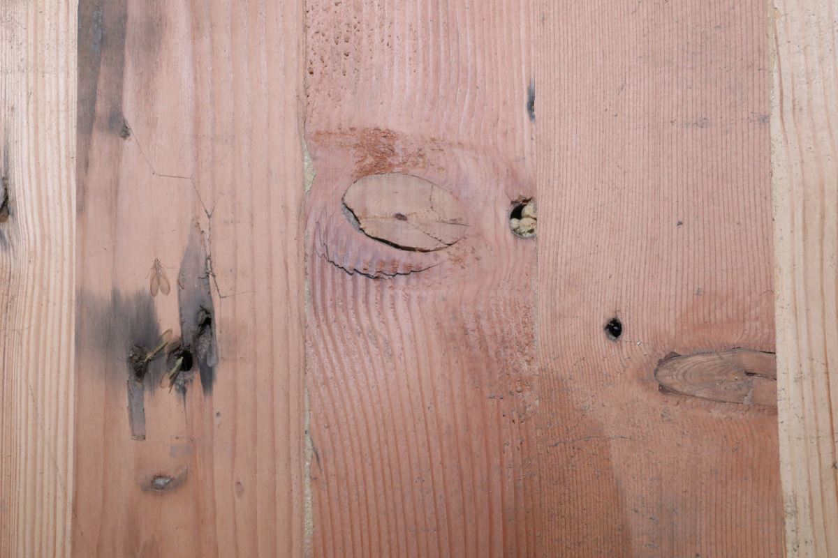 This particular pine block table top is unfinished, with uncut ends and surfaces ready for sanding. It has no legs, offering flexibility for customisation. The wood sections show their reclaimed origins through nail holes, screw marks and small dents. These features tell a story of previous use, giving the piece genuine character. Left untouched, it could serve beautifully as a workbench or rustic counter. With some sanding and varnish, however, the original colour and grain will reappear, enhanced by the subtle patina of its past life.
