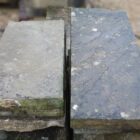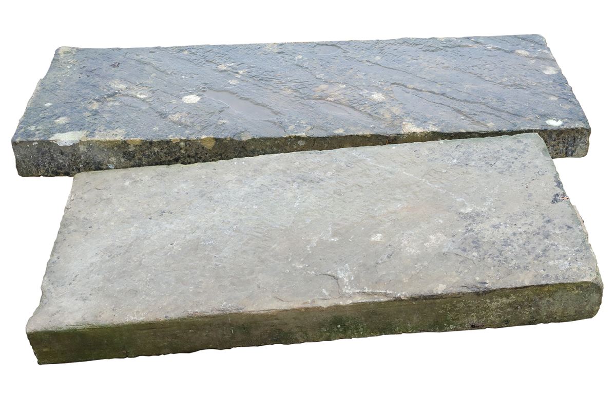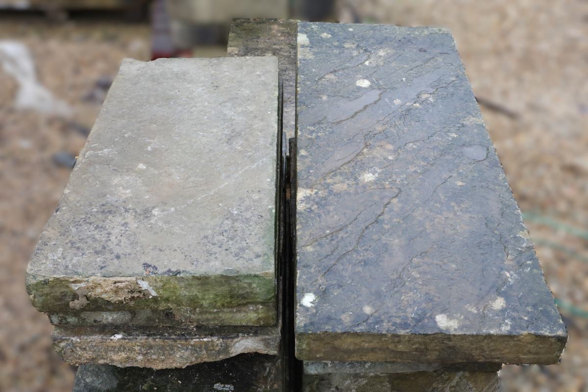 Each flat Yorkstone coping measures 18 inches wide and 3 inches thick, with lengths varying for flexible installation. Being reclaimed, they show the marks of age and previous service, including worn edges, patches of lichen and weather softened surfaces. Occasional remnants of old mortar on the ends reinforce their genuine heritage. This weathering gives every piece a unique patina that new stone cannot replicate.