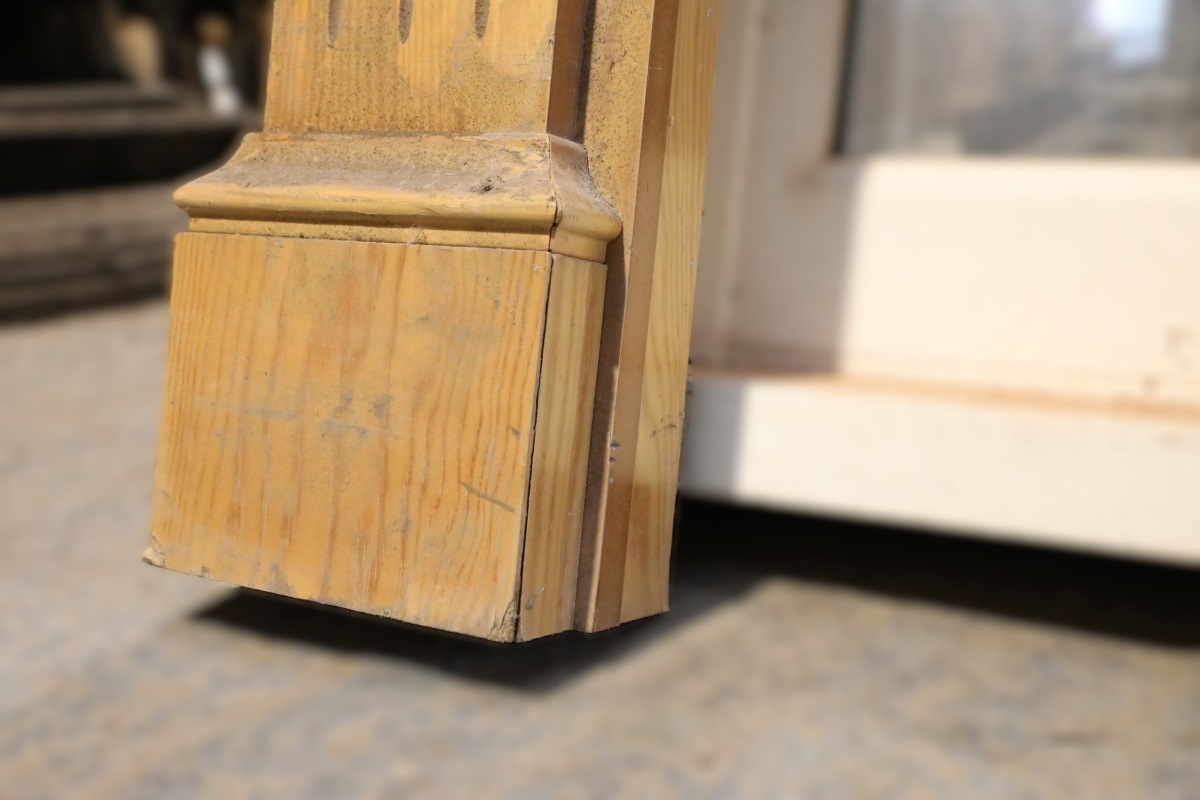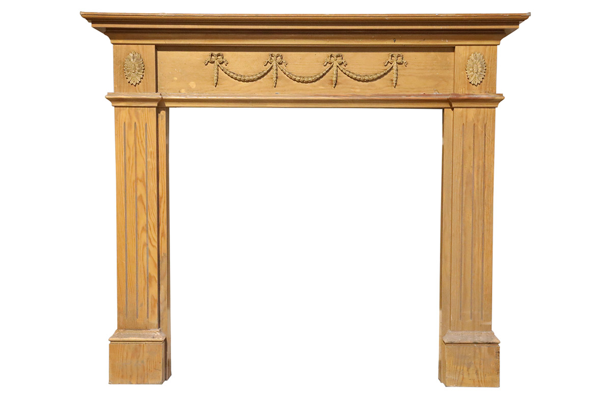 This reclaimed garlanded fire surround uses a carved garland motif that shows foliage and ribbons. Makers use this motif to suggest abundance and welcome. It became a common decoration on wooden fire surrounds because it softens strong architectural lines and brings gentle visual interest to the hearth. This reclaimed garlanded fire surround uses that motif with pleasing restraint. The carving sits subtly across the frieze and draws the eye without overwhelming the piece. It’s built with Pine and MDF, which gives the structure strength and stability. Although the MDF mantel shows some corner damage from storage, the surround remains robust and dependable.