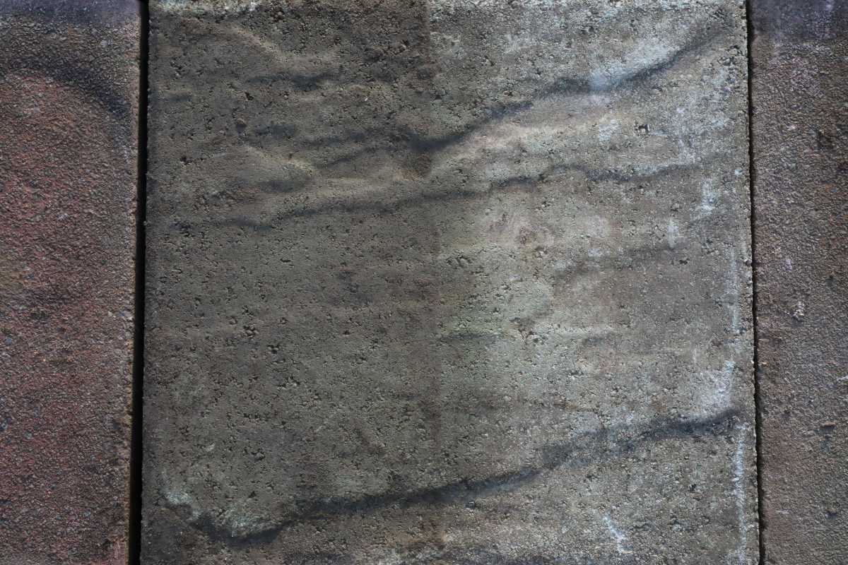 After two years in storage, the slabs show uneven weathering across their surfaces. However, this variation will soften quickly once laid. Exposure to the elements evens out tone and texture. Consequently, reclaimed riven concrete slabs soon blend into a unified paved area.