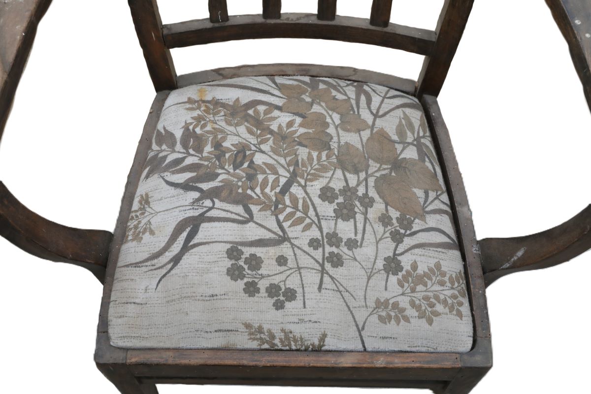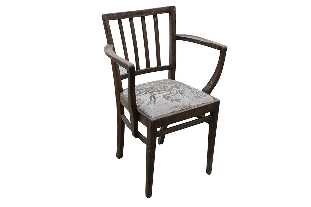This vintage reclaimed upholstered wooden chair reflects a thoughtful balance of utility and understated style. The splayed arms, curved back and padded, upholstered seat provide elegant comfort, while the sturdy construction ensures durability. Its design integrates beautifully into period homes while offering subtle contrast in modern interiors.