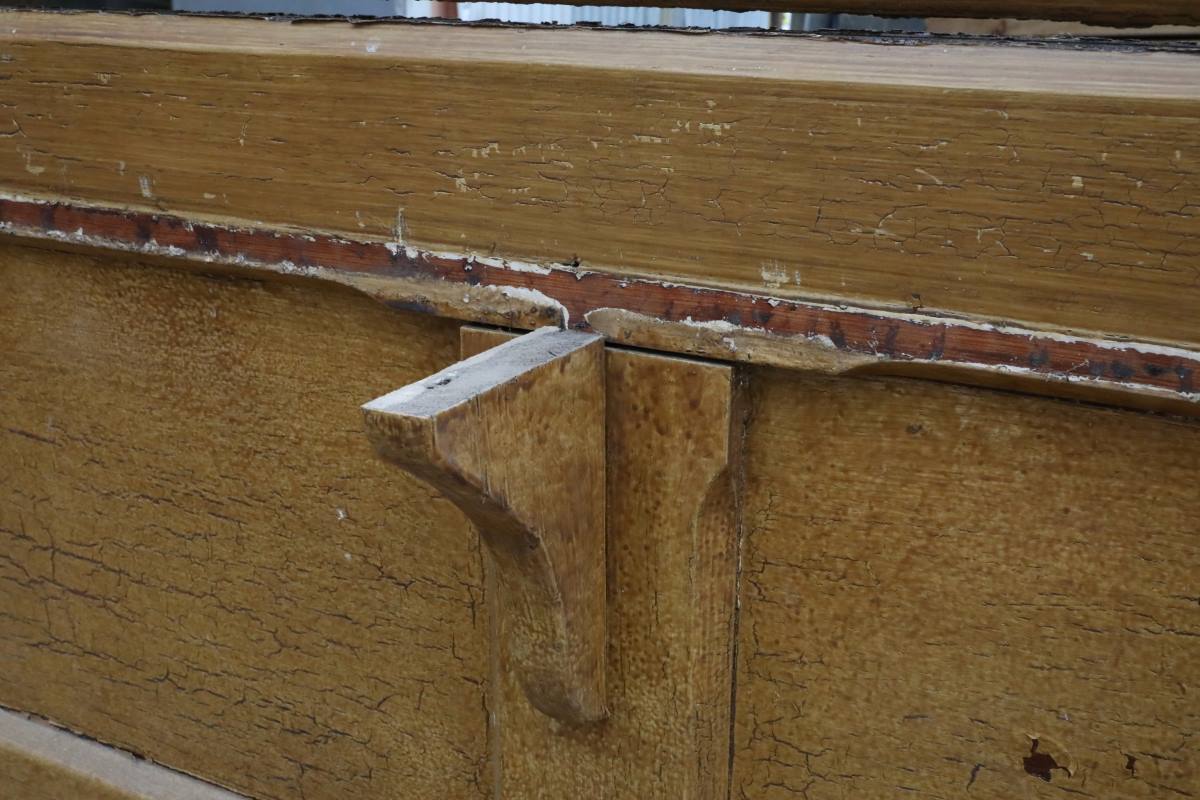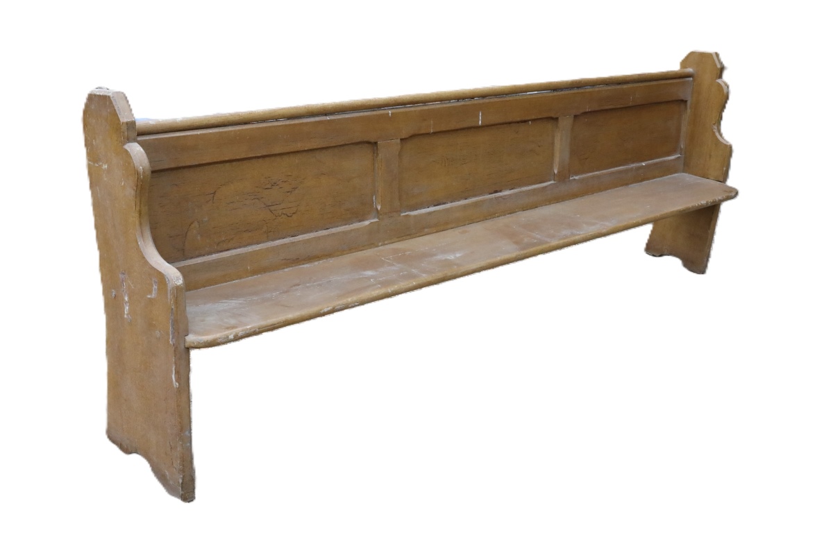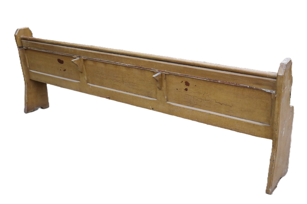 This reclaimed vintage church pew is an impressive piece of ecclesiastical furniture. Measuring over nine feet in length, standing more than 37 inches high, and weighing around 50 kilograms, it offers substantial presence and durability. Made from hardwood and coated in a pale protective paint, it displays the craftsmanship associated with traditional church furnishings. The finish shows ‘crawling’ from age, along with scuffs, scratches and slight discolouration to the feet. These details create a rugged, lived-in appearance that speaks of long service and quiet devotion. With light refurbishment, this reclaimed vintage church pew will once again display its full beauty and purpose.