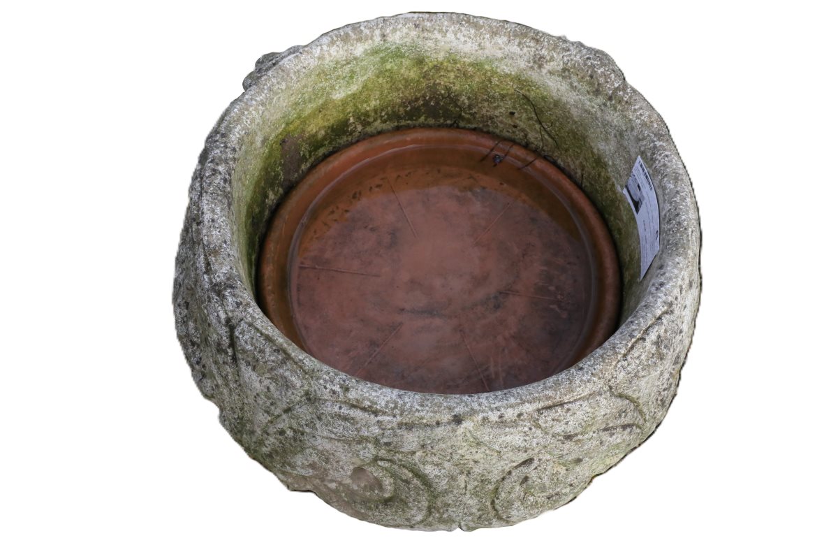 This reclaimed reconstituted stone bowl planter features subtle external decoration. A simple floral motif repeats around the circumference, adding restrained classical detail. This decorative band contrasts nicely with the clean, contemporary bowl shape. Inside the planter, a terracotta tray remains fixed at the base. Originally, it supported a broad-based flower pot and assisted drainage.
