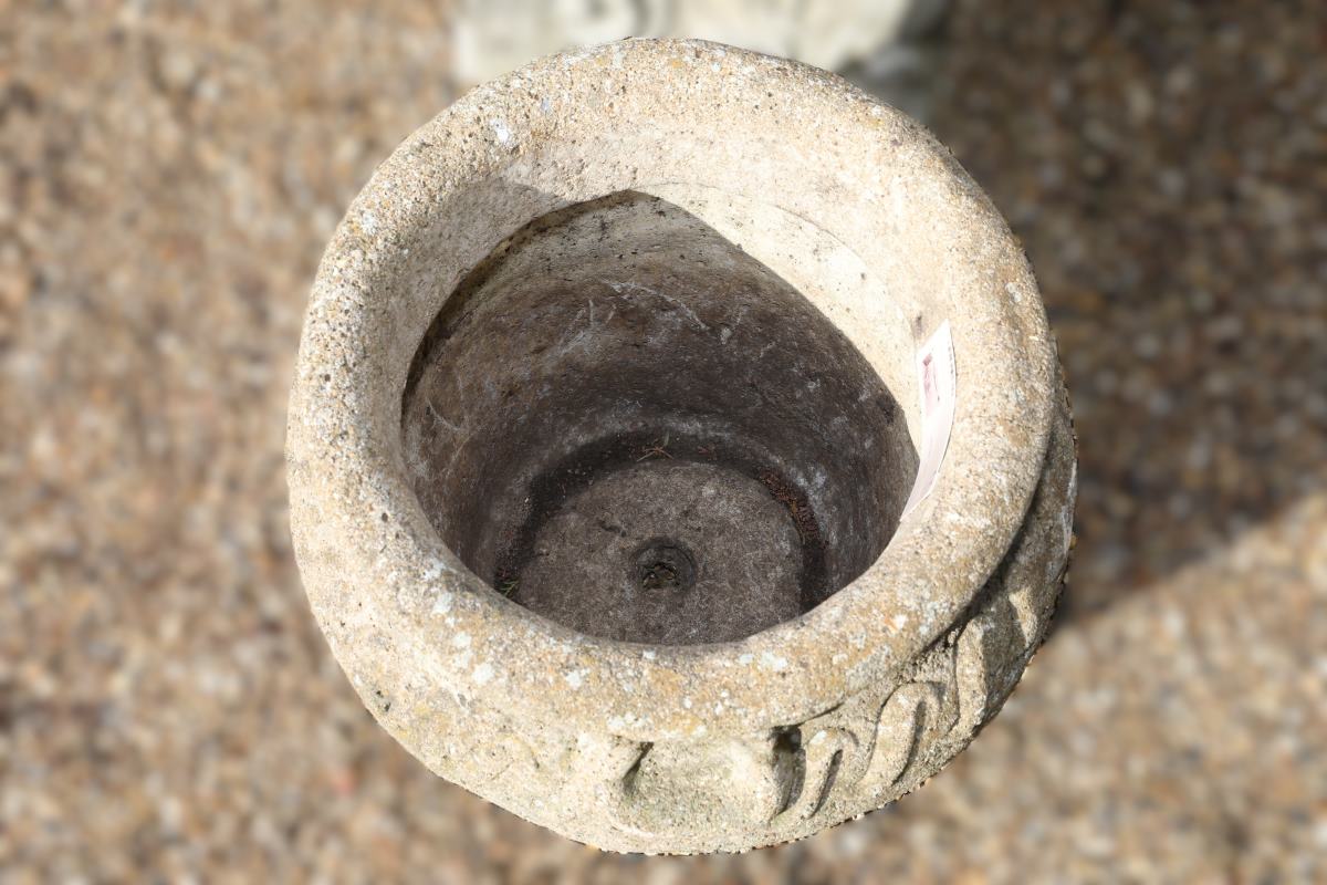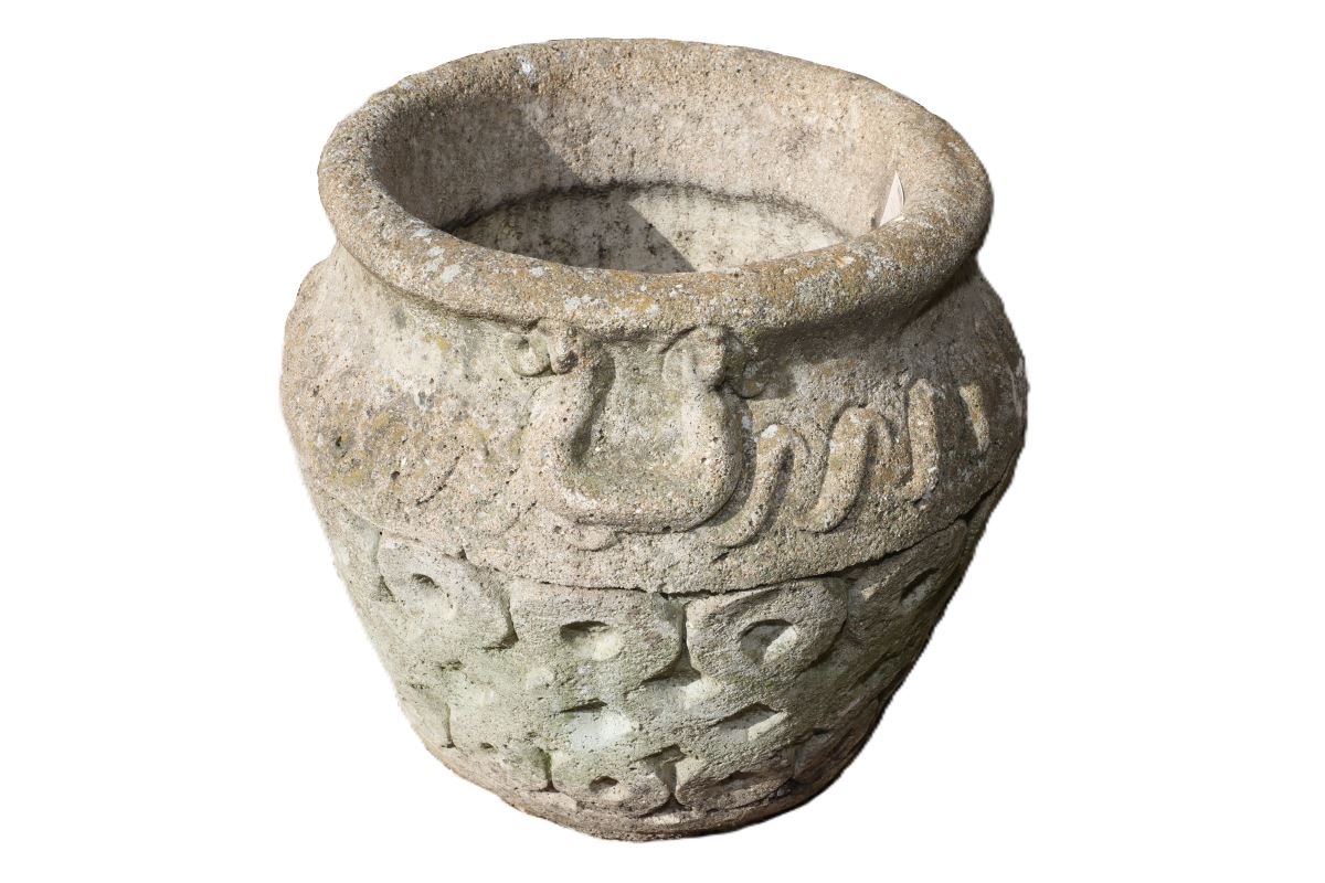 The decorative design draws inspiration from Mediterranean styles. A cast handle sits neatly at the rim, positioned above a flowing wave motif. Beneath this, an energetic scroll pattern reflects the movement of ocean currents. Consequently, this reconstituted stone Cotswold planter sits well with other planters and introduces visual interest without overwhelming its surroundings.