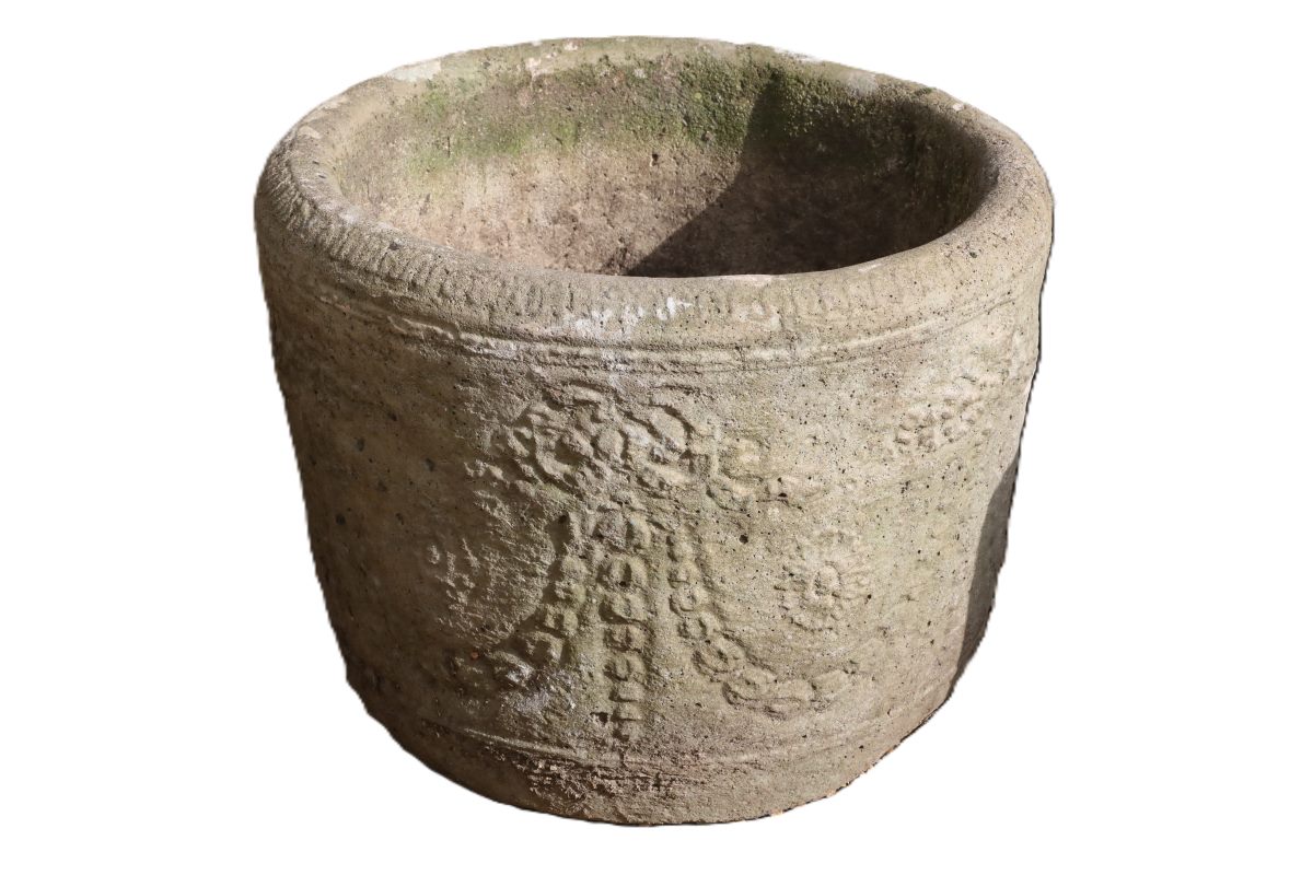 As a reclaimed piece, this planter displays surface wear, light scuffs, and areas of natural discolouration. However, these marks reflect genuine age and outdoor use rather than damage. Furthermore, the weathering softens its appearance and helps it settle naturally into established planting schemes. The reconstituted stone garland planter therefore blends effortlessly with older materials and mature greenery.