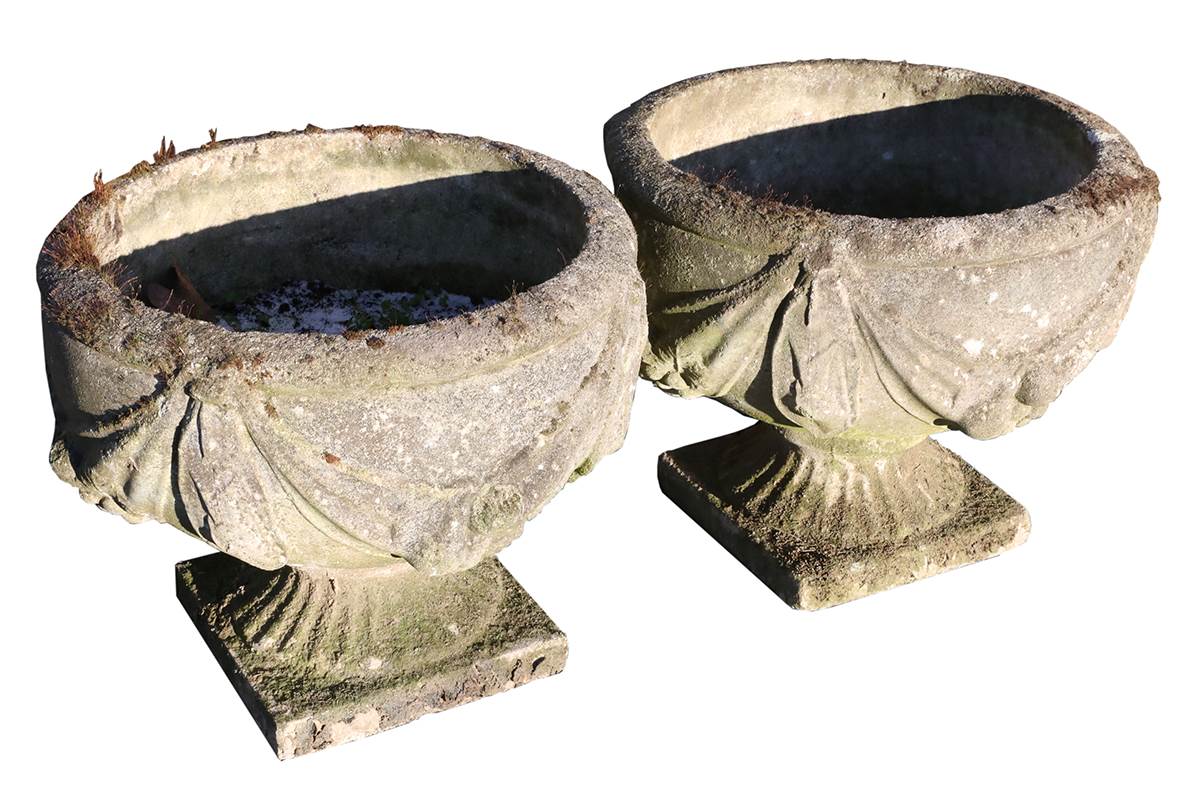 This pair of reconstituted stone garland urns offers classical form combined with proven outdoor durability. Weathered over many years, these urns bring an authentic aged aesthetic to any garden or patio. Alternatively, for greater visual impact, pair with separate plinths to provide height and presence in larger lawns. Their size allows for planting with flowers or small shrubs.