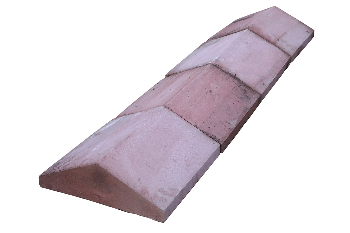 These red cast stone saddleback wall copings have never been installed, yet they have spent several years in storage. As a result, gentle weathering has formed across the faces. This softens the appearance and helps them blend easily with existing brickwork or stonework. However, they still provide the full performance expected from new production. They resist frost, handle moisture well and maintain structural integrity through constant weather cycles.