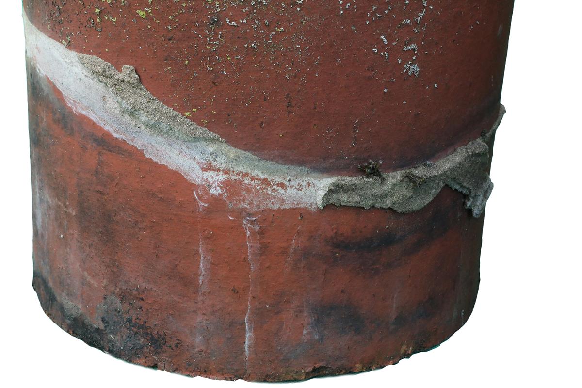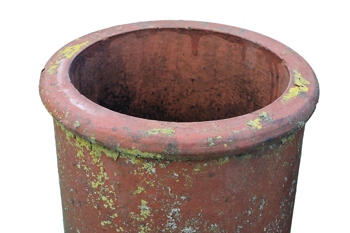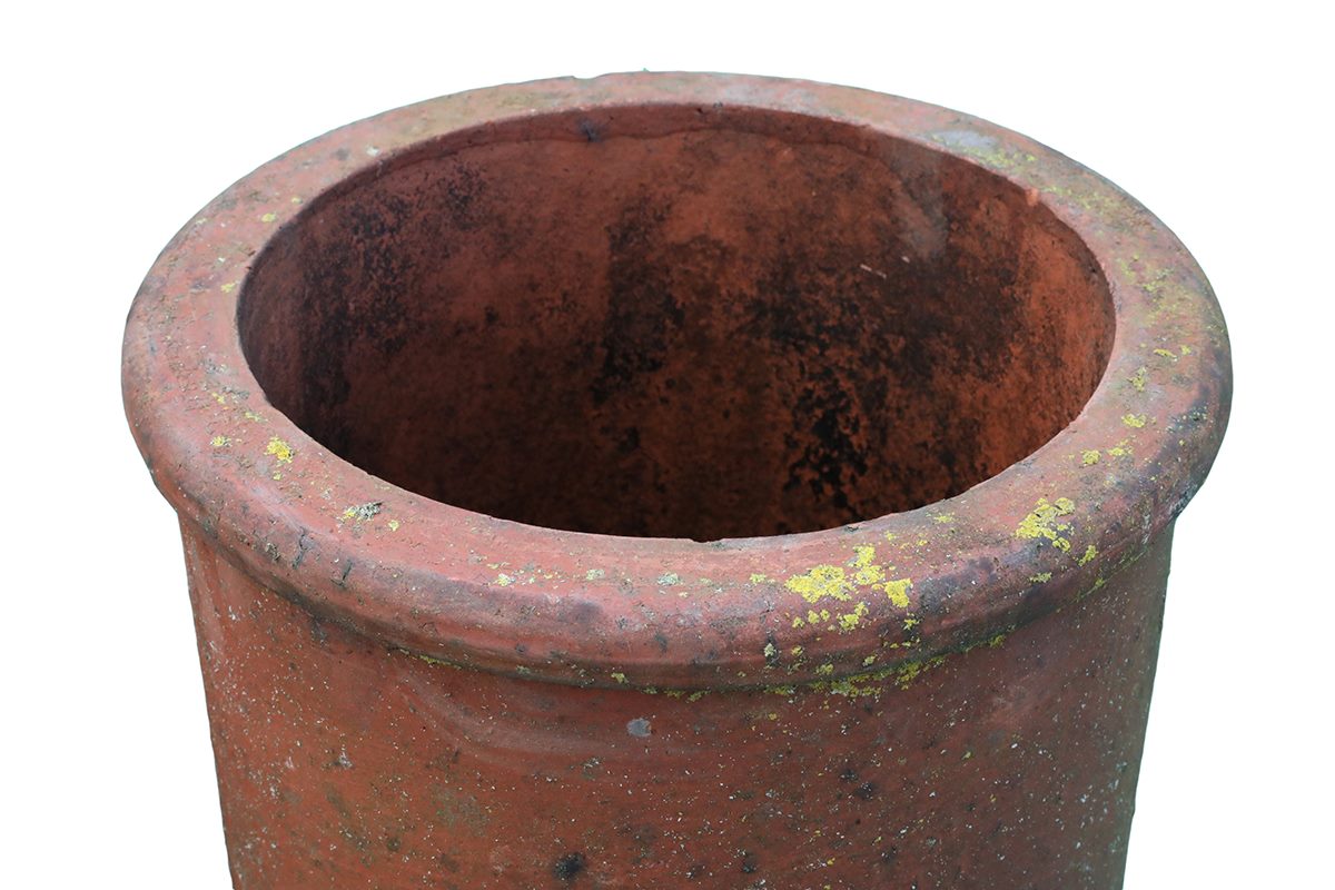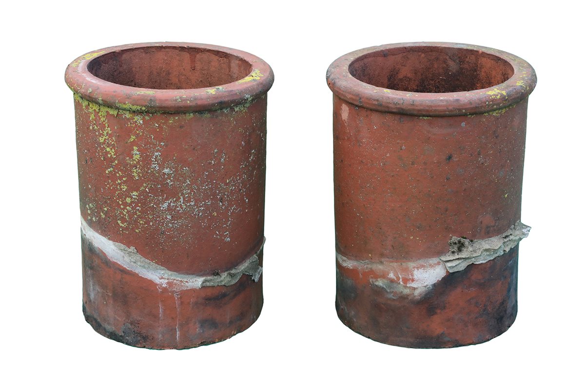 This pair of small roll top chimney pots features the classic rounded rim and straight sides that guide smoke cleanly from the flue. Because they are reclaimed, each pot carries signs of a working life. Minor chips, surface marks and patches of mortar appear across both pieces. Environmental discolouration adds depth to the surface. Even so, these signs of age create a patina that blends instantly with established roofs. The result feels honest and well suited to period buildings.