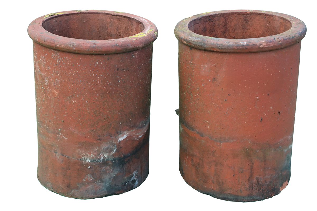 This pair of small roll top chimney pots offers character, history and practical versatility for homes and gardens. Aside from their original purpose, they suit use on patios, to frame a pathway entrance or integrate them into a larger display. They remain easy to move thanks to their smaller scale, yet they still provide a striking vertical accent.