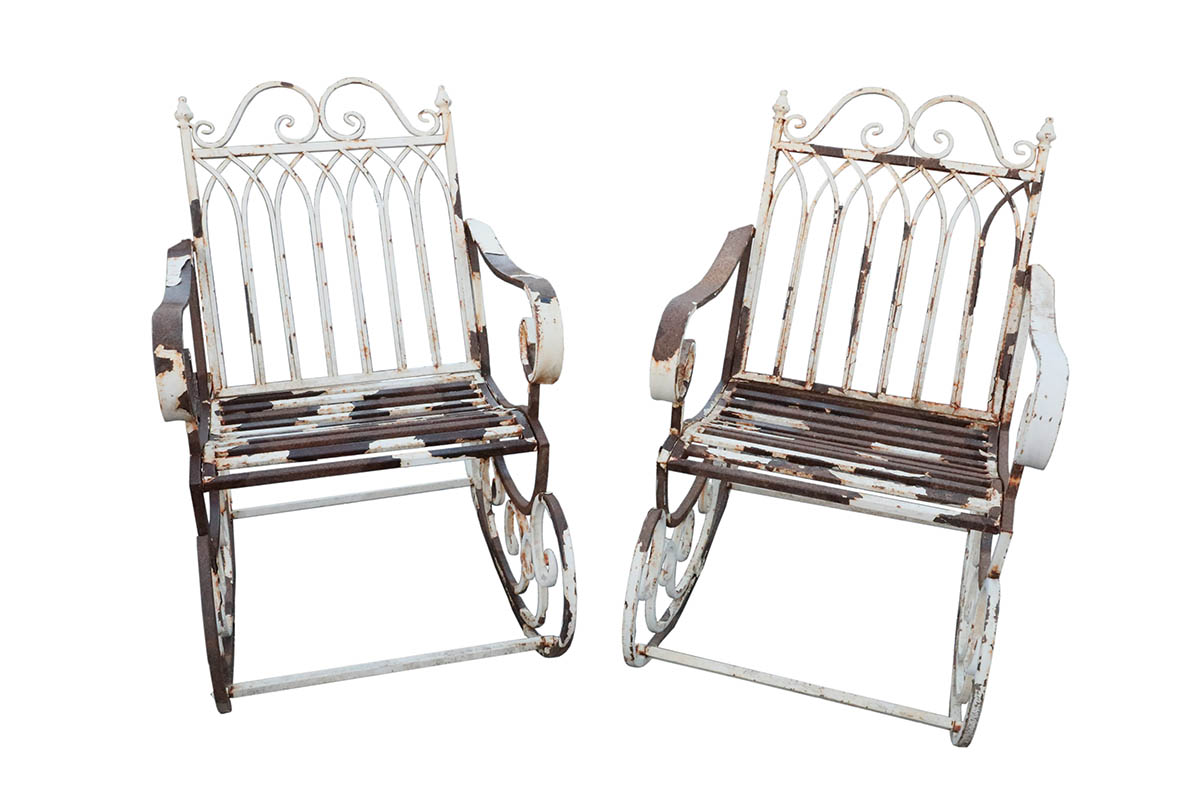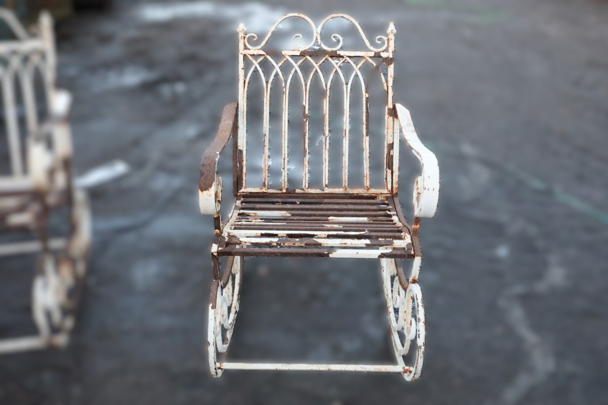 Today, steel garden rocking chairs continue this tradition, offering reliability alongside strong visual presence. These examples show honest wear from years spent in UK gardens facing rain, frost, and seasonal temperature changes. White paint has peeled back in places, allowing the steel beneath to corrode naturally. This surface corrosion records their age and confirms genuine outdoor use rather than artificial distressing.