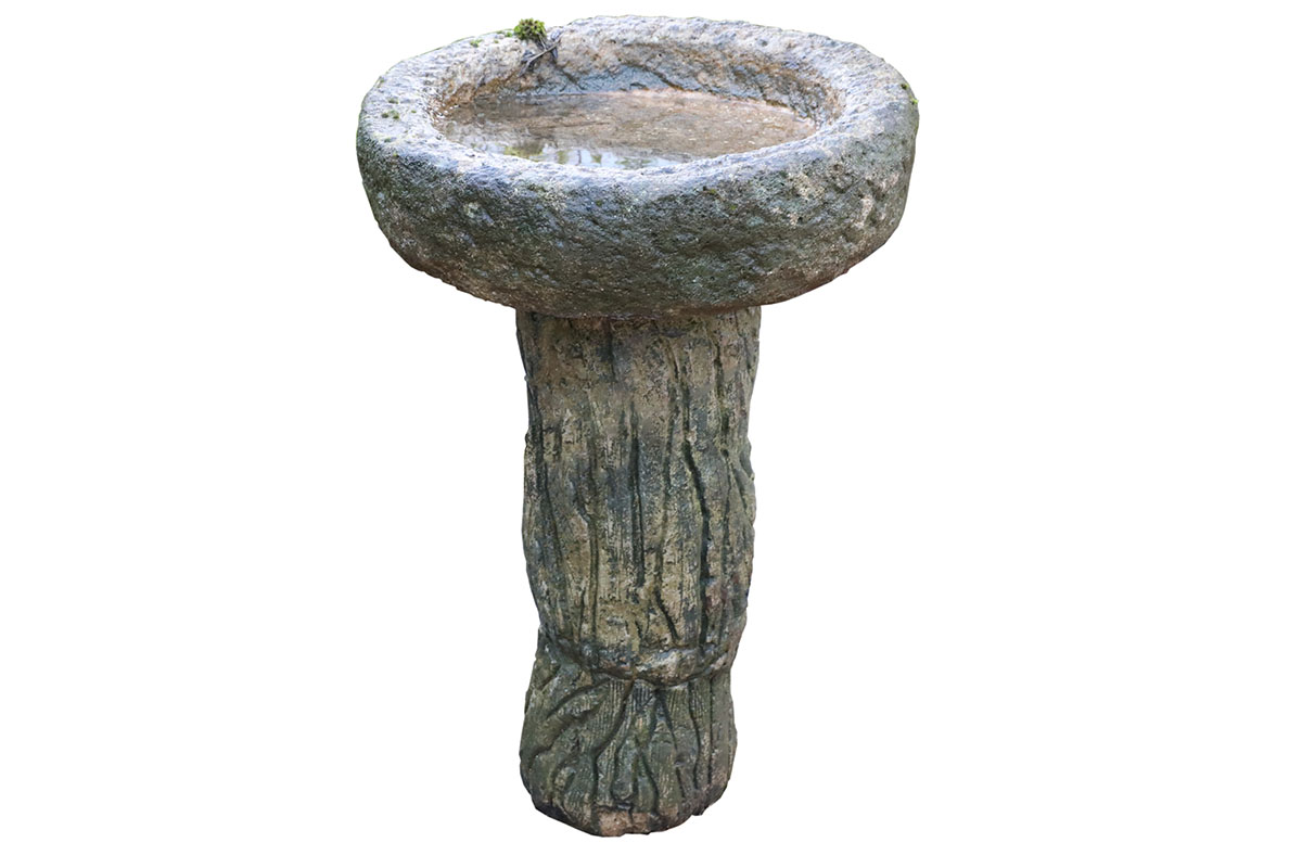 This weathered composite stone tree trunk style bird bath reflects years of gentle use in a local garden, bringing a subtle patina to its functional integrity. It stands ready to continue serving wildlife in a new setting, as a garden focal point or a hidden gem wrapped in clematis or honeysuckle in a wild garden. The composite stone is both durable and frost resistant.