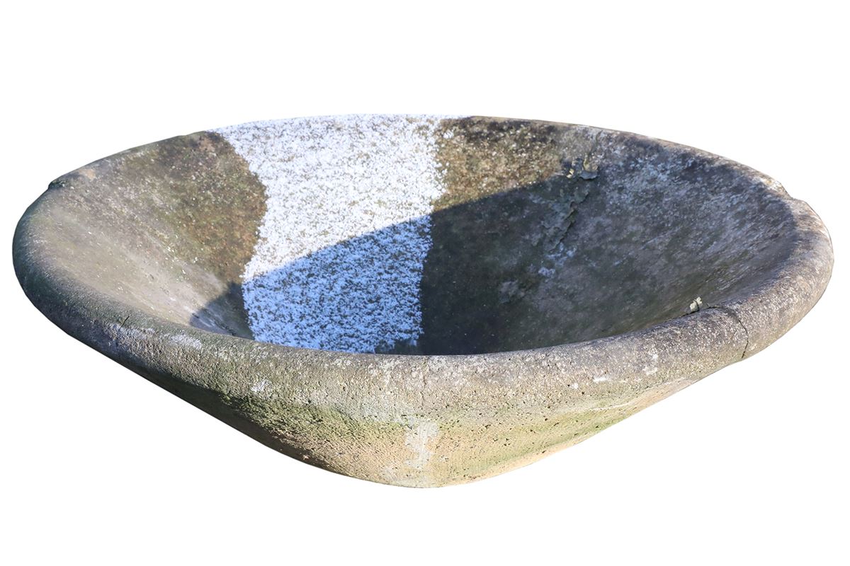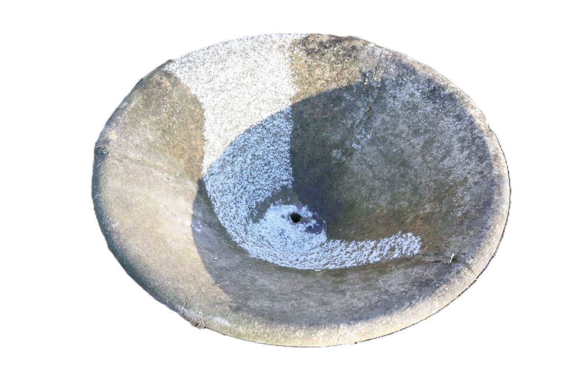 Recovered from a local garden, this planter has already endured years of exposure. Over time, its surface has developed a softened look, echoing the appearance of natural stone. Patches of lichen and moss now sit alongside gentle surface discolouration. Small chips and marks further enhance its aged presence. This weathering can’t be convincingly recreated on newly manufactured garden containers. Therefore, this concrete tapered planter integrates easily into mature traditional gardens with its weathered finish. At the same time, it complements contemporary layouts through simple material and restrained form.