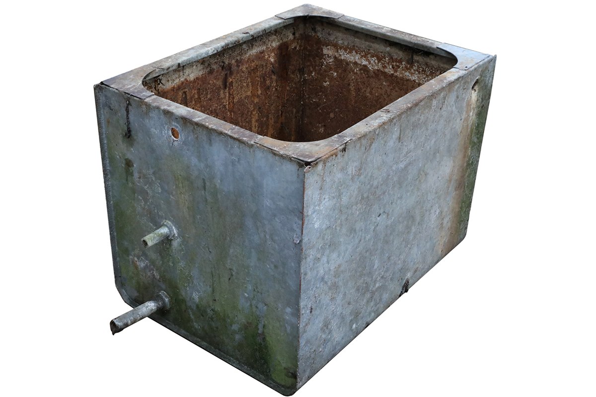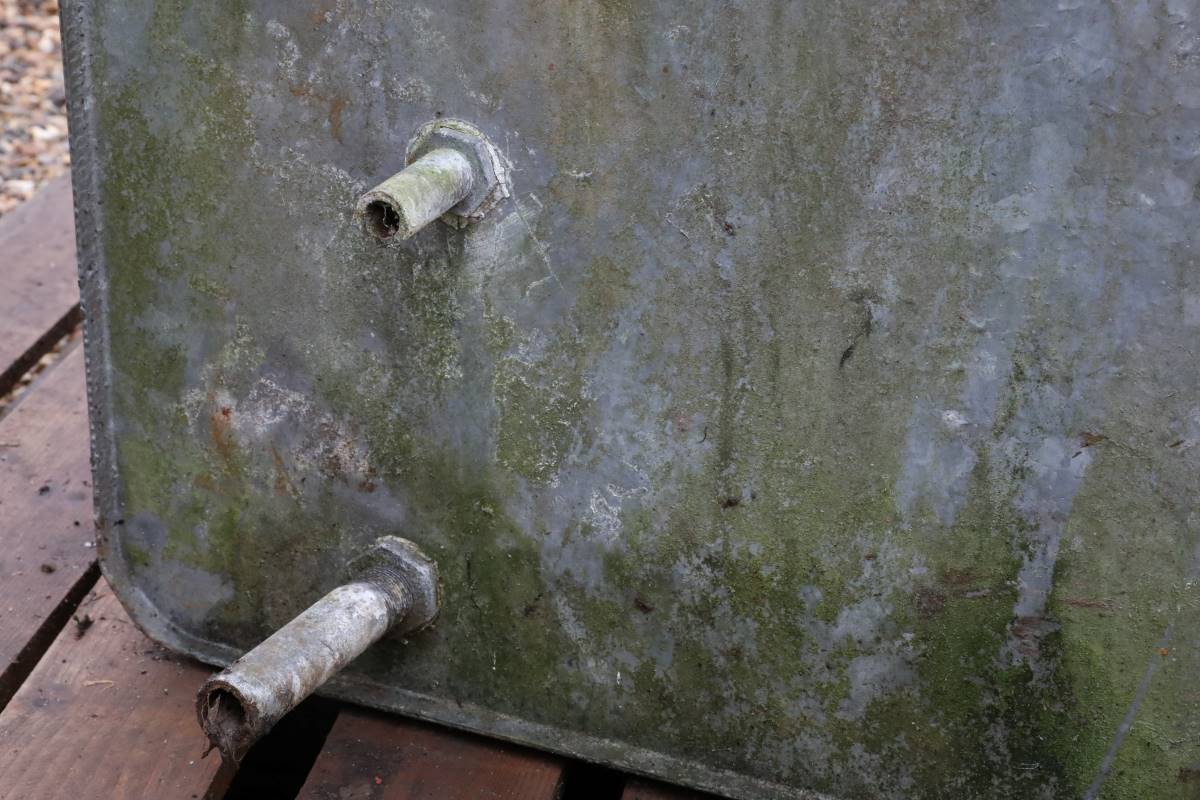 This weathered galvanised water tank offers practical water storage alongside visible history from decades of outdoor use. Designed for efficiency, it holds approximately 170 litres and includes inlet and outlet pipes with an overflow fitting hole. Until recently, it formed part of a working rainwater collection system serving a large garden.
