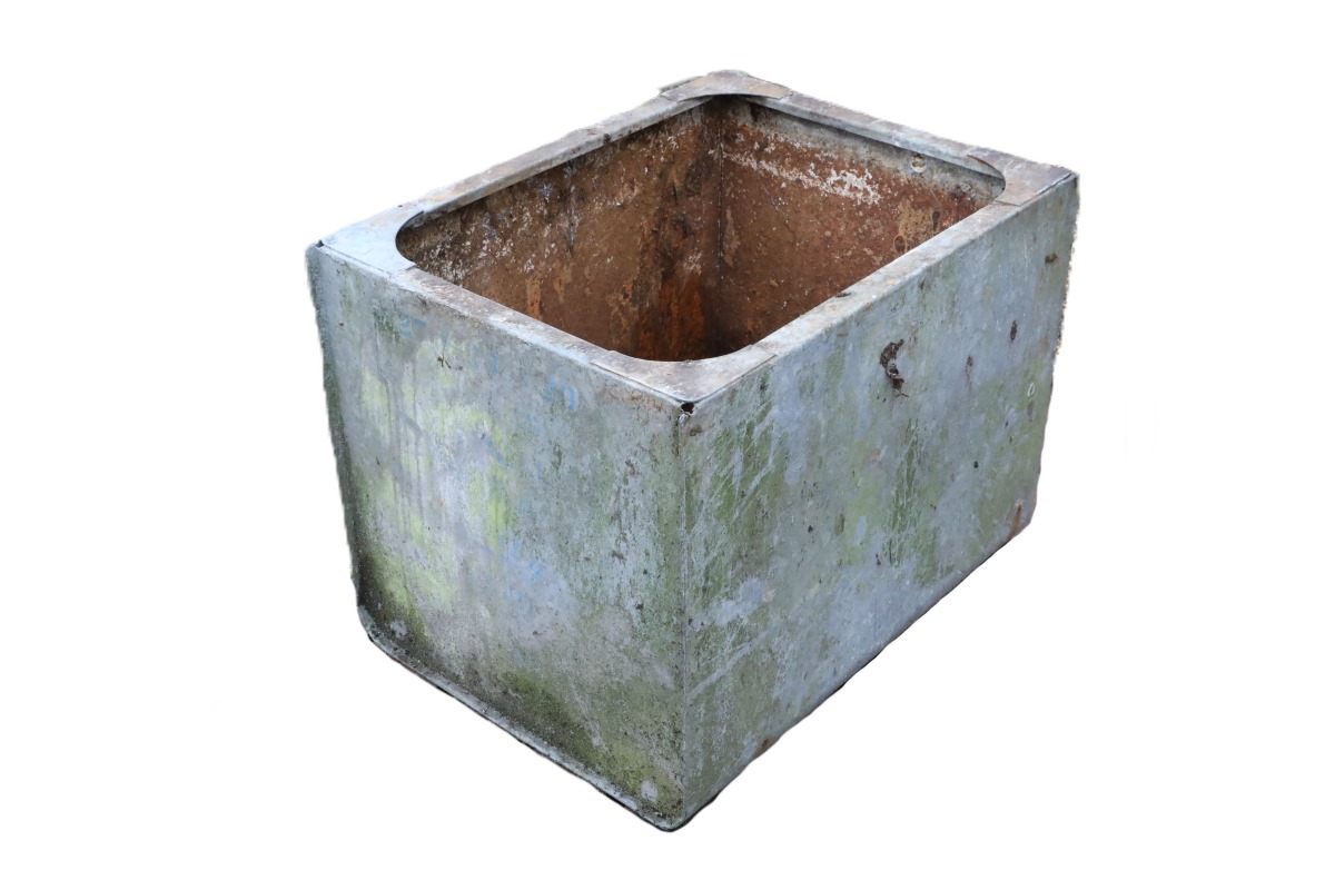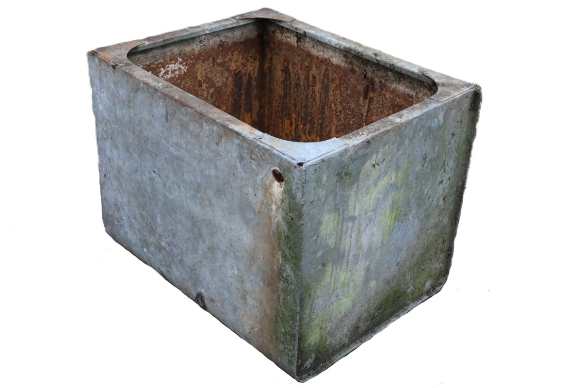 This weathered galvanised water tank offers practical water storage with weathered aesthetics from decades of outdoor use. Designed with function in mind, it holds approximately 170 litres and includes inlet and outlet pipes with an overflow fitting hole. Recently forming part of a working rainwater collection system serving a large garden, it suits both wild and formal gardens.