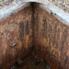 The reclaimed condition of this weathered galvanised water tank remains clear and authentic throughout its structure. Small patches of lichen scatter across the surface, while knocks and marks record years of everyday use. Additionally, widespread discolouration reflects long exposure to rain, frost, and seasonal temperature changes. Inside, corrosion covers the interior surfaces and base, confirming its long service life outdoors.