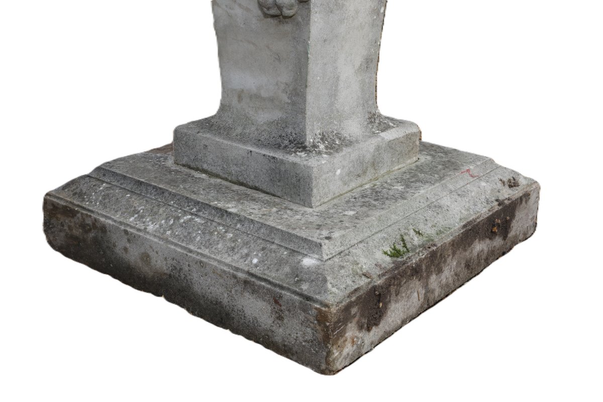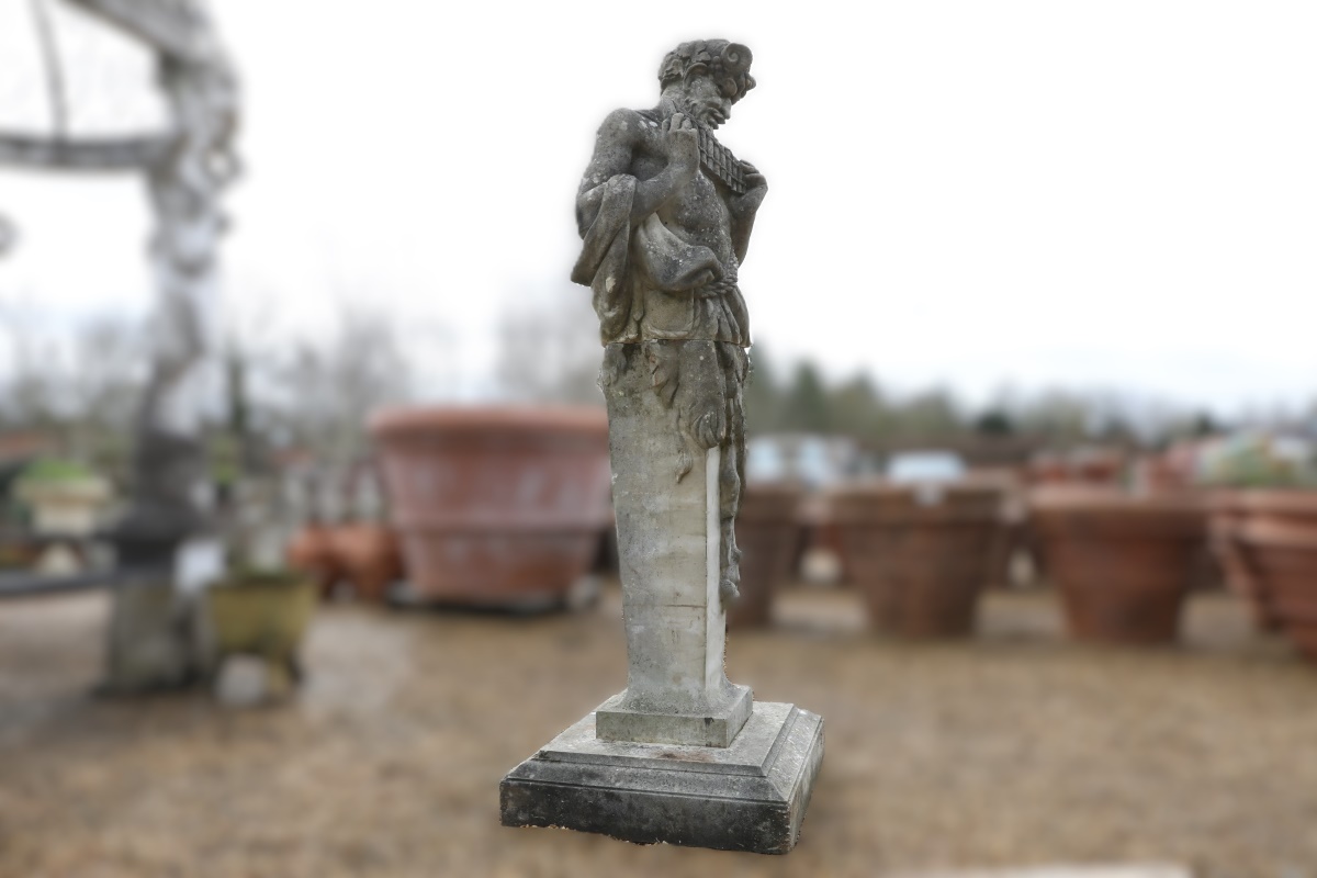 Standing two metres tall and weighing 300kg, this weathered statue of the god Pan and his pipes forms an imposing focal point. Crafted from reconstituted stone, it was made in three sections: base, trunk and torso. Reconstituted stone emerged in the nineteenth century as artisans sought durable, affordable alternatives to carved stone. Makers combine crushed natural stone with high-quality binders and pigments. As a result, the finished piece mirrors the texture and strength of quarried stone. It also allows for detailed casting while reducing waste from solid blocks.