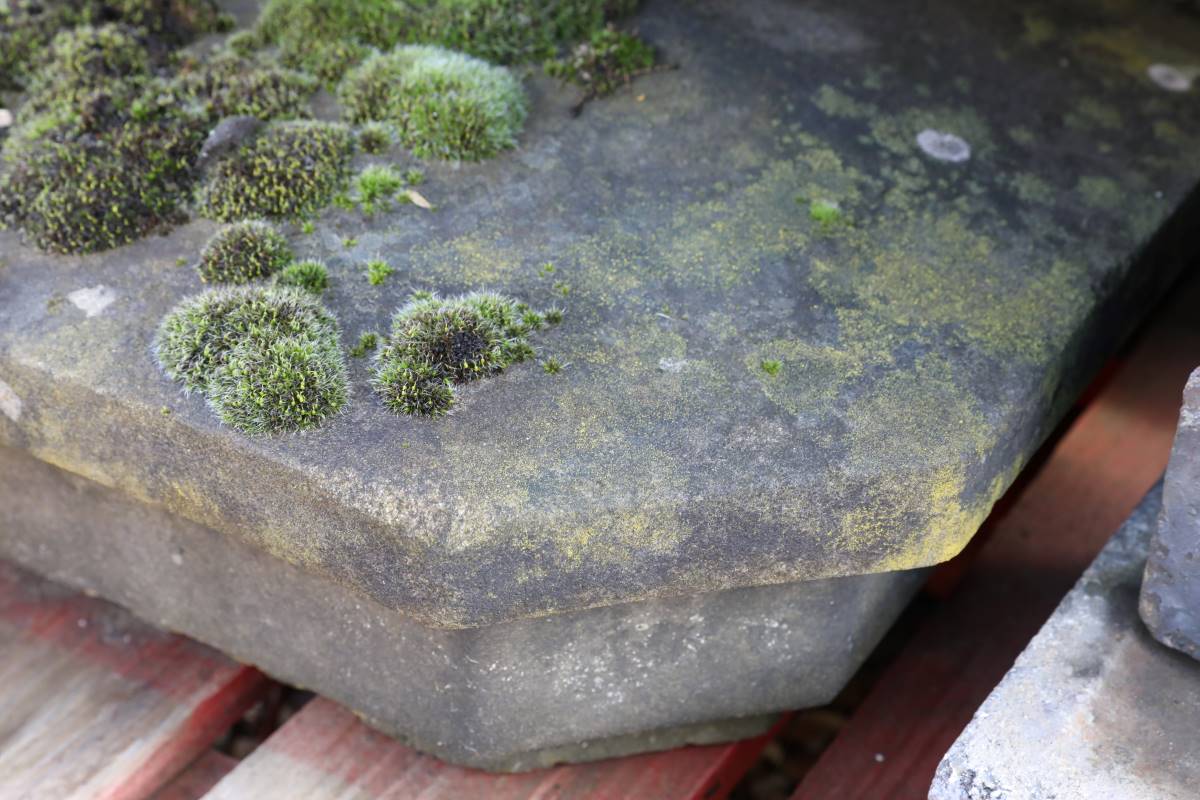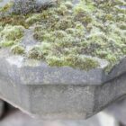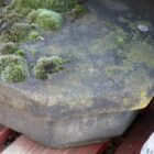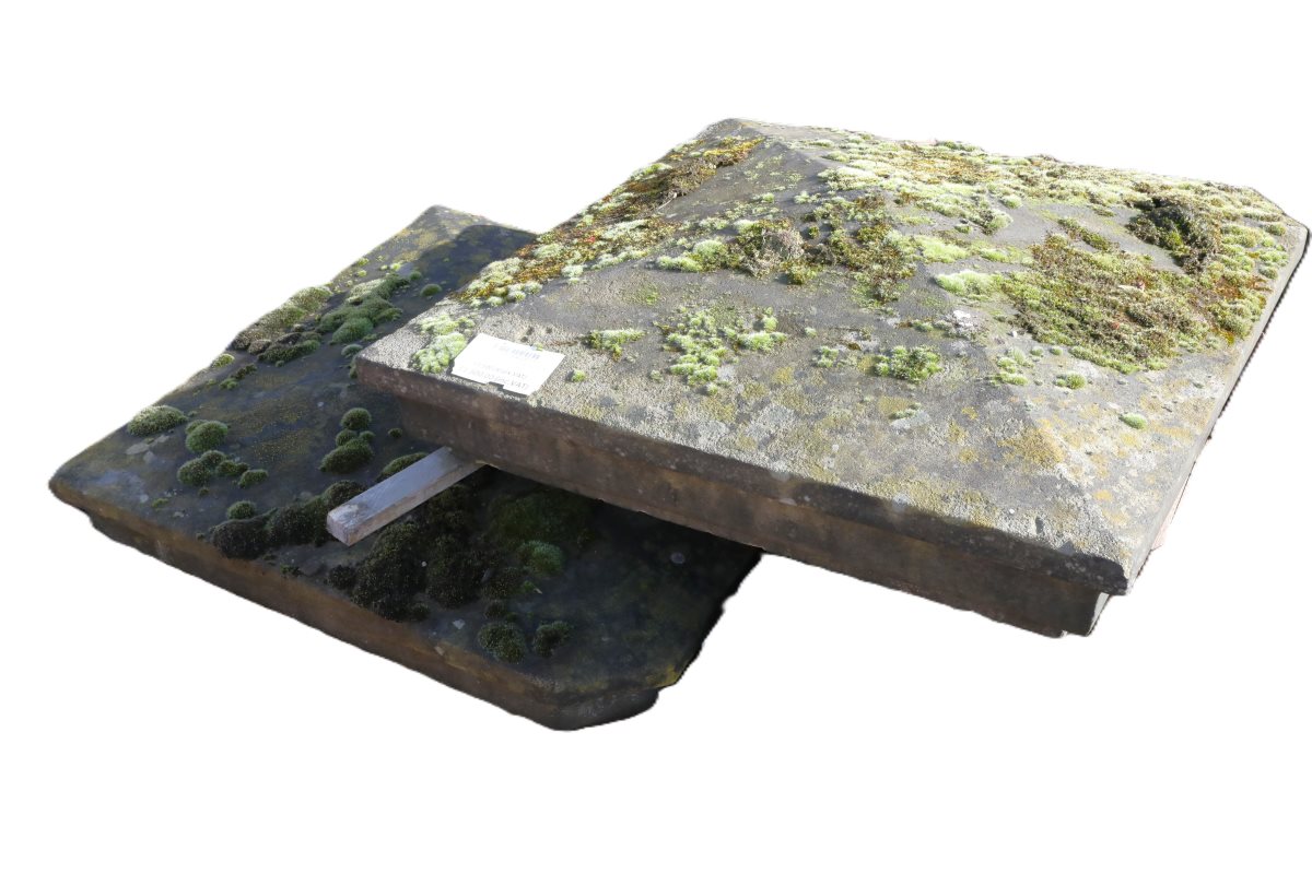 The surfaces clearly show age and previous use. Large patches of moss sit alongside small chips and softened edges. Additionally, environmental discolouration adds depth and texture across the stone. Therefore, these antique Yorkstone Pyramid pier caps blend seamlessly with established garden walling.
